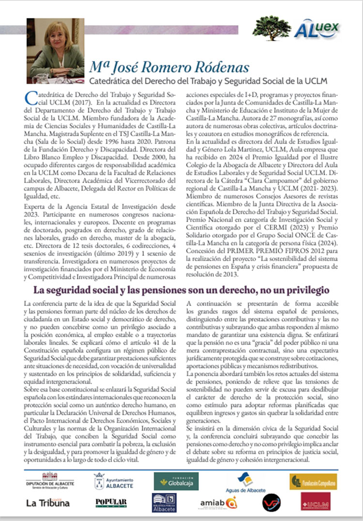 Conferencia número 22. LA SEGURIDAS SOCIAL Y LAS PENSIONES SON UN DERECHO, NO UN PRIVILEGIO. María José Romero Ródenas. Catedrática del Derecho del Trabajo y Seguridad Socia de la UCLM