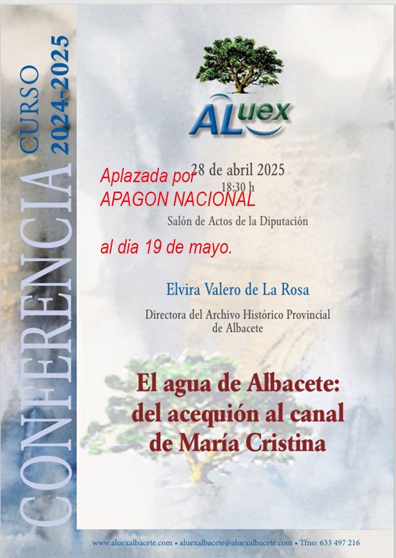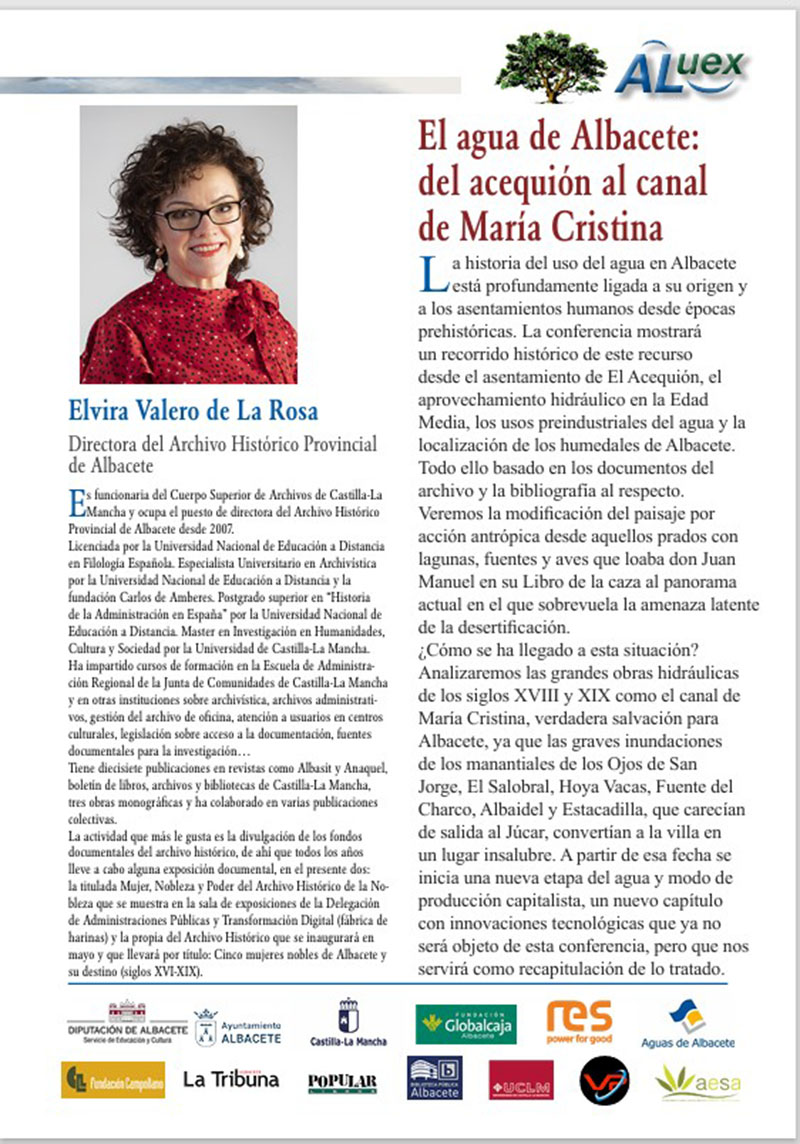 28 abril EL AGUA DE ALBACETE: DEL ACEQUIÓN AL CANAL DE MARÍA CRISTINA. Elvira Valero de la Rosa. Directora del Archivo Histórico Provincial. Boletín de la conferencia: