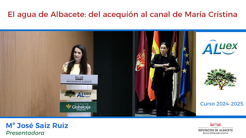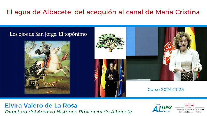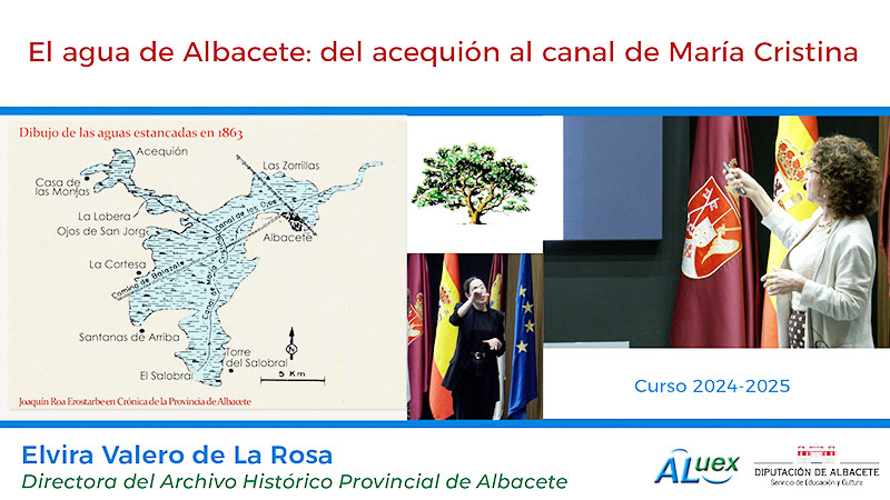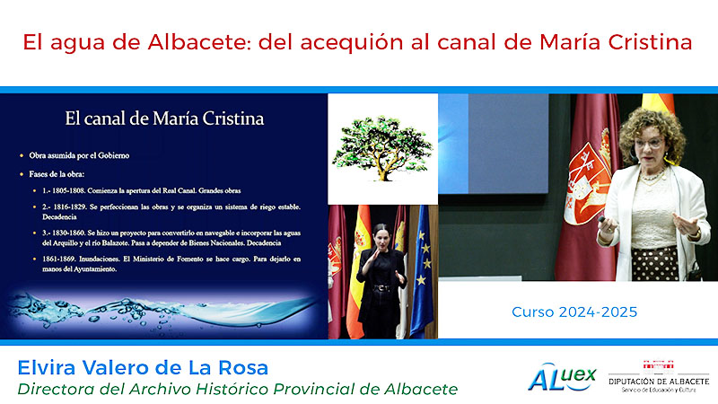 EL AGUA EN ALBACETE: DEL ACEQUIÓN AL CANAL DE MARÍA CRISTINA. Elvira Valero de la Rosa.. Directora del Archivo Histórico Provincial de Albacete. Fotogramas de la conferencia editadas por Carmela Sainz de Baranda: