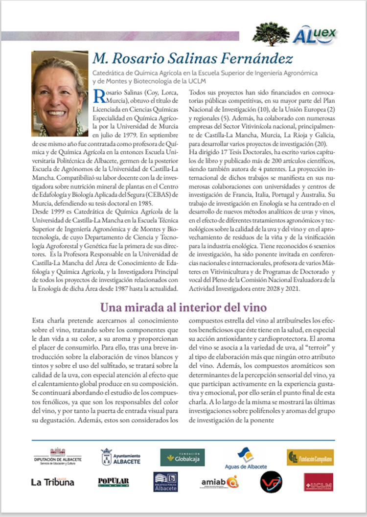 UNA MIRADA AL INTERIOR DEL VINO. Mª Rosario Salinas Fernández. Catedrática de Química Agrícola en la Escuela Superior de Ingeniería Agronómica y de Montes y Biotecnología de la UCLM.