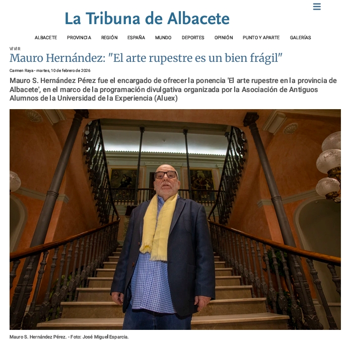 9 de febrero 2026. Conferencia número 14. EL ARTE RUPESTRE EN LA PROVINCIA DE ALBACETE. Entrevista en el periódico La Tribuna de Albacete: ¿Cuál es el enfoque de la ponencia? Es un repaso por lo que significan más de 100 años de descubrimientos del arte rupestre en la provincia de Albacete que la convierten en uno de los territorios más privilegiados para el estudio de las sociedades antiguas. Sobre todo de aquellos aspectos de los que no hay testimonios escritos y, por lo tanto, el arte rupestre se convierte en el elemento más importante para informarnos de sus modos de vida, de sus creencias, sus relaciones con el medio y con los otros individuos. ¿Cuál fue el primer descubrimiento de este tipo en la zona de Albacete? Tuvo lugar en Alpera en 1920 y después Minateda. A partir de ese momento se han ido sucediendo los descubrimientos hasta que en 1998 la Unesco declaró el arte rupestre del arco mediterráneo, donde se incluye Albacete, patrimonio mundial. ¿Hay motivos o imágenes singulares en la provincia? En Albacete, hay escenas exclusivas que permiten reflexionar sobre la sociedad del pasado. Es el caso, por ejemplo, del excepcional conjunto de Minateda y no digamos del conjunto extraordinario de abrigos que se concentran en la zona de Nerpio. Hay imágenes de lucha, de guerras de maneras de enfrentarse unos individuos a otros y hay también escenas que sugieren relaciones familiares. ¿Qué técnicas y materiales usaron los autores de este arte rupestre? Se hablaba de sangre y de un montón de mitos, pero hoy sabemos que son pinturas naturales obtenidas de barros y de óxidos de hierro, mezclados con alguna grasa, algún aglutinante que permitieran fijarse a la pared. Utilizan pinceles elaborador con fibras vegetales, con pelos e incluso con los dedos. ¿Han cambiado las nuevas tecnologías la forma de aproximarse a las pinturas rupestres? Hay avances extraordinarios. En Albacete se han ensayado técnicas para conseguir imágenes más nítidas que apenas se veían y que ahora, gracias a los nuevos métodos de tratamiento de imágenes, se pueden observar. Estamos en un momento de esplendor. Hay también una serie de iniciativas que ponen al servicio de la población estos descubrimientos. Destacaría la labor extraordinaria que realiza el Instituto de Estudios Albacetenses, al crear una serie de publicaciones sobre las pinturas rupestres en distintos pueblos, que son un referente por la calidad de las publicaciones, las ediciones y por lo excepcional de los textos. ¿A qué amenazas se enfrenta el arte rupestre? El arte rupestre es un bien frágil que mantener. Al estar al aire libre está afectado por cambios atmosféricos, contaminación, lluvia e incluso también por los propios animales. |