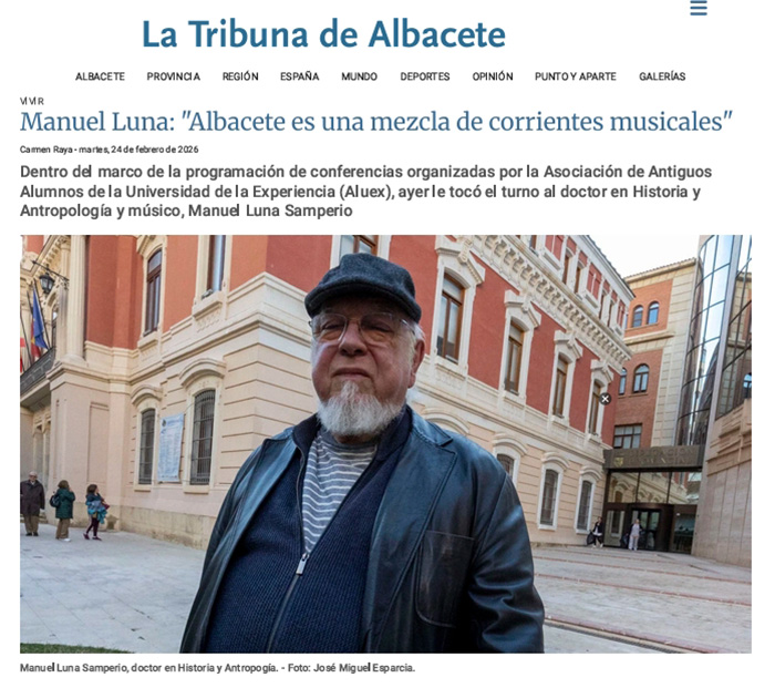 23 de febrero 2026. Conferencia número 16. LA CONSERVACIÓN DIGITAL DEL PATRIMONIO Entrevista en el periódico La Tribuna de Albacete: ¿De dónde viene su pasión por lo etnomusical? Ocurrió hace bastantes años y en ese momento vivía en Albacete y empecé a preocuparme por lo que había sido la memoria cultural de los mayores, sobre todo de los espacios rurales En un tiempo en el que las distancias entre el campo y la ciudad no eran tantas. Es decir, que yo he conocido una Albacete con la gente felicitándose las Pascuas cantando aguilanderos por las casas. Eso estaba en la ciudad misma. Porque, de hecho, hay una visibilización un poco errónea de las relaciones entre el campo y la ciudad. Estamos hablando de los años 70 y por mis aficiones musicales y a las ciencias sociales, asumí los conocimientos de la antropología social para interpretar lo que iba descubriendo. Que eran, ni más ni menos, que formas de la cultura patrimonial que se habían, no sólo perdido, sino que se habían maltratado. ¿Cuáles son los principales retos técnicos al digitalizar este patrimonio? Primero, crear una base de datos que atienda desde la antropología social, todos los elementos que constituyen no solamente la descripción musicológica de las piezas que ahí se comprenden, sino también los contextos rituales en las que se desarrollan. Después hablaríamos de matices respecto a las interpretaciones y las formas de tocas porque la lengua sonora de la cultura campesina es distinta. No corresponde con el de la música general. Por último, sería importante poner en uso público las maneras de hacer de este 'mundillo' que, por cierto, ahora es el protagonista de gran parte de los eventos de música tradicional que suceden en el sureste de España, gracias a que el movimiento cuadrillero y las rondas están recuperando las tradiciones. ¿Hay alguna pieza o tradición sonora que considere especialmente representativa de la provincia? No hay elementos que tenga ese componente de representación simbólica de la identidad. La provincia de Albacete es una mezcla de corrientes musicales de la Península Ibérica. Hay una parte castellana, que es la propiamente de La mancha y La Manchuela, y hay una parte, diríamos, serrana, que bebe de las tradiciones murciano andaluzas. Hay que tener en cuenta que de un pueblo a otro pueblo la cosa varía. Esa es otra de las características del mundo de la música campesina, que hay una variación permanente. ¿Cómo describiría el estado actual de conservación del patrimonio sonoro? Ha habido una recuperación, diríamos, de todas estas zonas de música campesina y en la provincia han aparecido muchísimas rondas. Tenemos nuevos investigadores jóvenes que trabajan desde la etnomusicología, y esto ha variado notablemente el panorama actual. Nos encontramos en un momento de una riqueza mucho mayor que la que hubo hace 40 o 30 años.