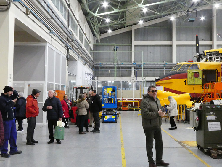 Por el número de asistentes de ALUEX, el personal de la Maestranza nos dividió en dos grupos, dirigidos por la Cabo Dña. María Jesús Soria Valenciano y el cabo Primero D. Agustín Rodríguez ballesteros, incrementando así, la eficacia y eficiencia de nuestra visita. Fuimos visitando los distintos talleres que configuran el complejo de la Maestranza. Cada uno dedicado a una finalidad distinta, bien sea por reparación y construcción de piezas, bien sea por tipos de aeronaves a tratar. Vimos la precisión con la que se trabaja, en algunos casos llegando hasta la milésima de milímetro, la alta profesionalidad y tecnología sumamente diversa que debe asistir a los objetivos que se deben alcanzar. Aprendimos sobre la complejidad de los motores y otros componentes de los aviones, sobre la importancia de sus materiales con sus aleaciones. Y, al final a todos nos llamaron la atención las aeronaves para combatir los incendios, por sus grandes dimensiones, por su capacidad para la recogida, transporte y vertido de agua (dulce o salada) para su extinción o por su forma que le permite aterrizar o amerizar.