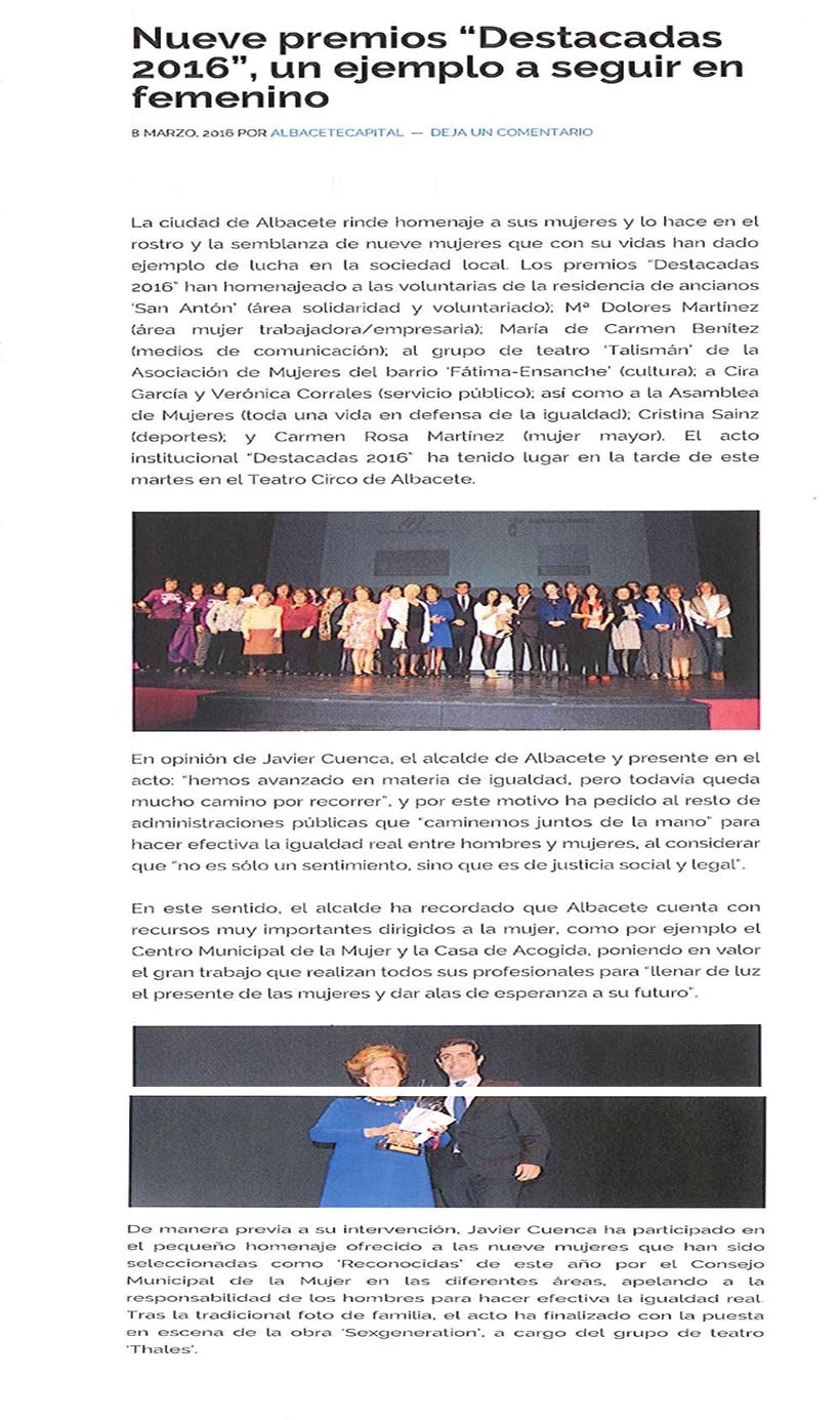 Información en la prensa digital local (Albacete Digita) conl motivo de EL DIA INTERNACIONAL DE LA MUJER y el acto que se celebró en el teatro Circo.
