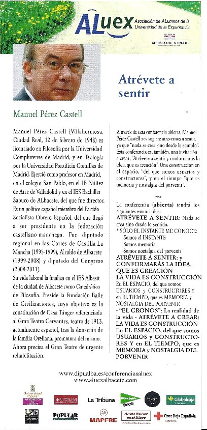 Conferencia12ª Lunes, 9 de enero 2017 Salón de Actos de la Diputación de Albacete LA MENTE Y EL CUERPO ATREVETE A SENTIR. D. Manuel Pérez Castell Catedrático de Filosofía. Ex-Alcalde de Albacete. Boletín de la conferencia