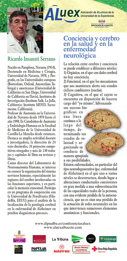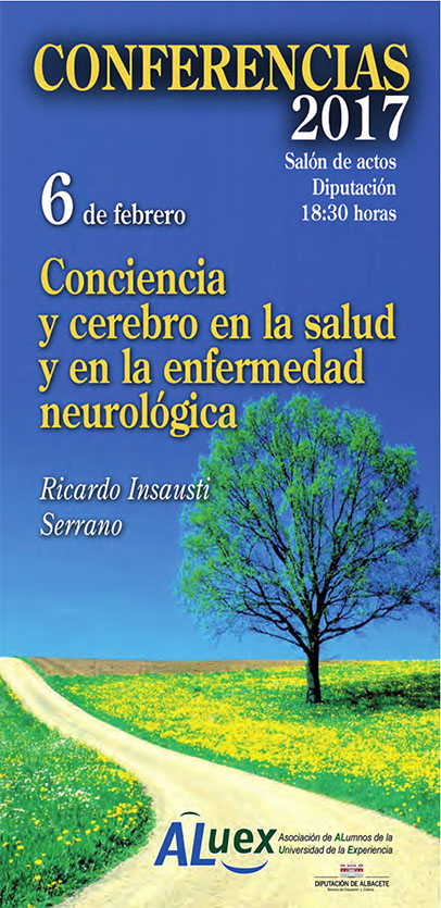 Conferencia 16ª Lunes, 6 de febrero 2017 CONCIENCIA Y CEREBRO EN LA SALUD Y EN LA ENFERMEDAD NEUROLÓGICA D. Ricardo Insausti Serrano Catedrático de Anatomía y Embriología Humana en la Facultad de Medicina de la UCLM Boletín informativo