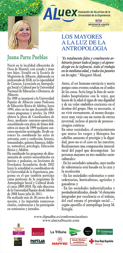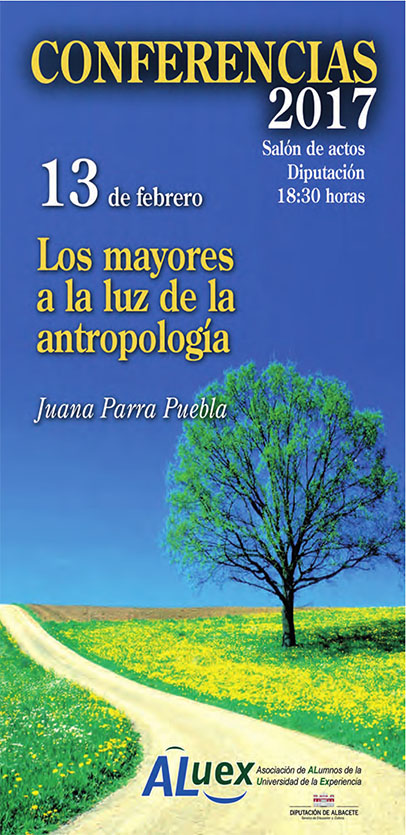 Conferencia 17ª Lunes 13 de febrero 2017 LOS MAYORES A LA LUZ DE LA ANTROPOLOGÍA Dña. Juana Parra Puebla Licenciada en Antropología Social y Cultural. Coordinadora de la Universidad de la Experiencia