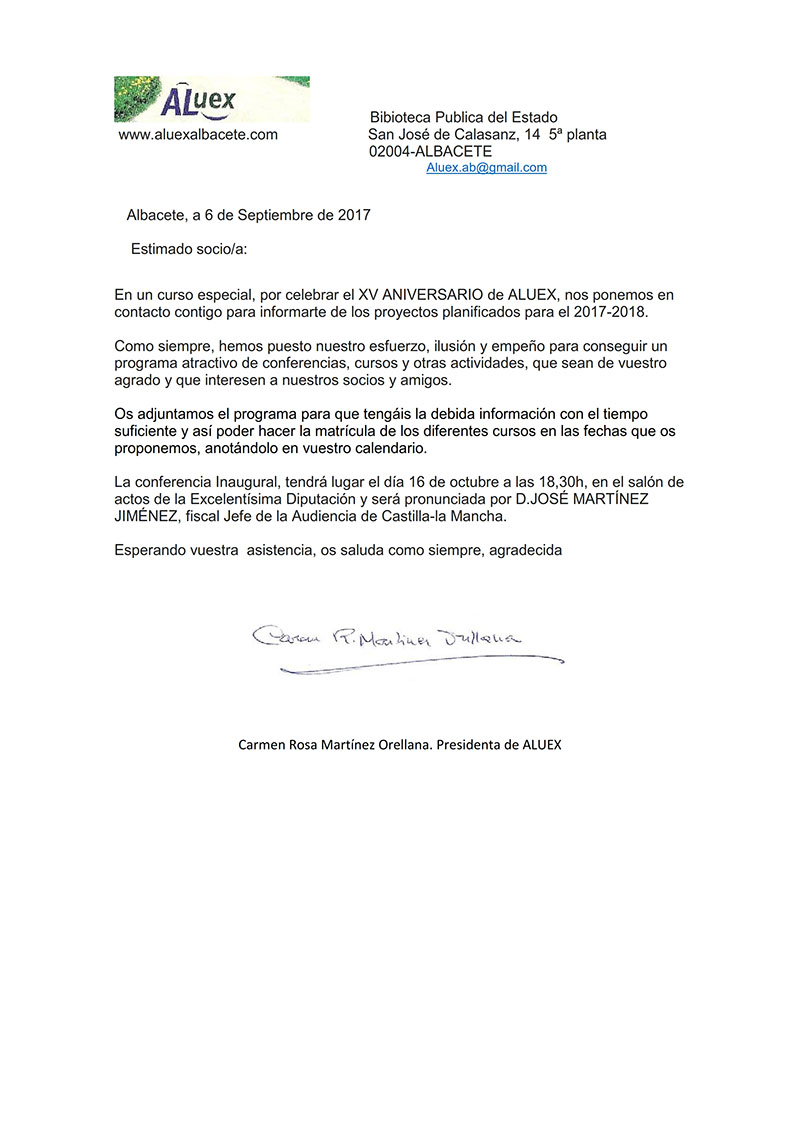 6 de septiembre 2017 CARTA ENVIADA A LOS SOCIOS CON MOTIVO DEL COMIENZO DEL CURSO 2017-2018 Fotografías