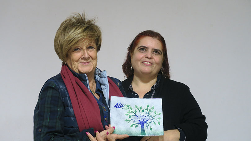 La presidenta de Aluex, Carmen Rosa Martínez Orellana hace entrega de la placa conmemorativa