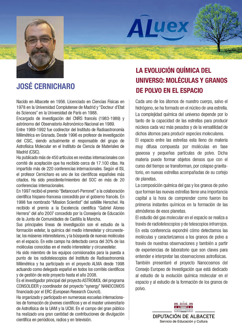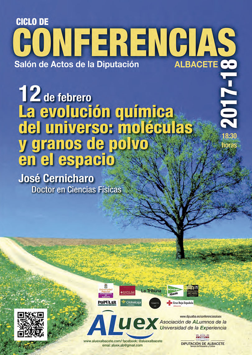 Lunes 12 de febrero 2018 Conferencia número 15 “LA EVOLUCIÓN QUÍMICA DEL UNIVERSO: MOLÉCULAS Y GRANOS DE POLVO EN EL ESPACIO”. D. José Cernícharo Quintanilla. Doctor en Ciencias Físicas Ver Boletín de la conferencia
