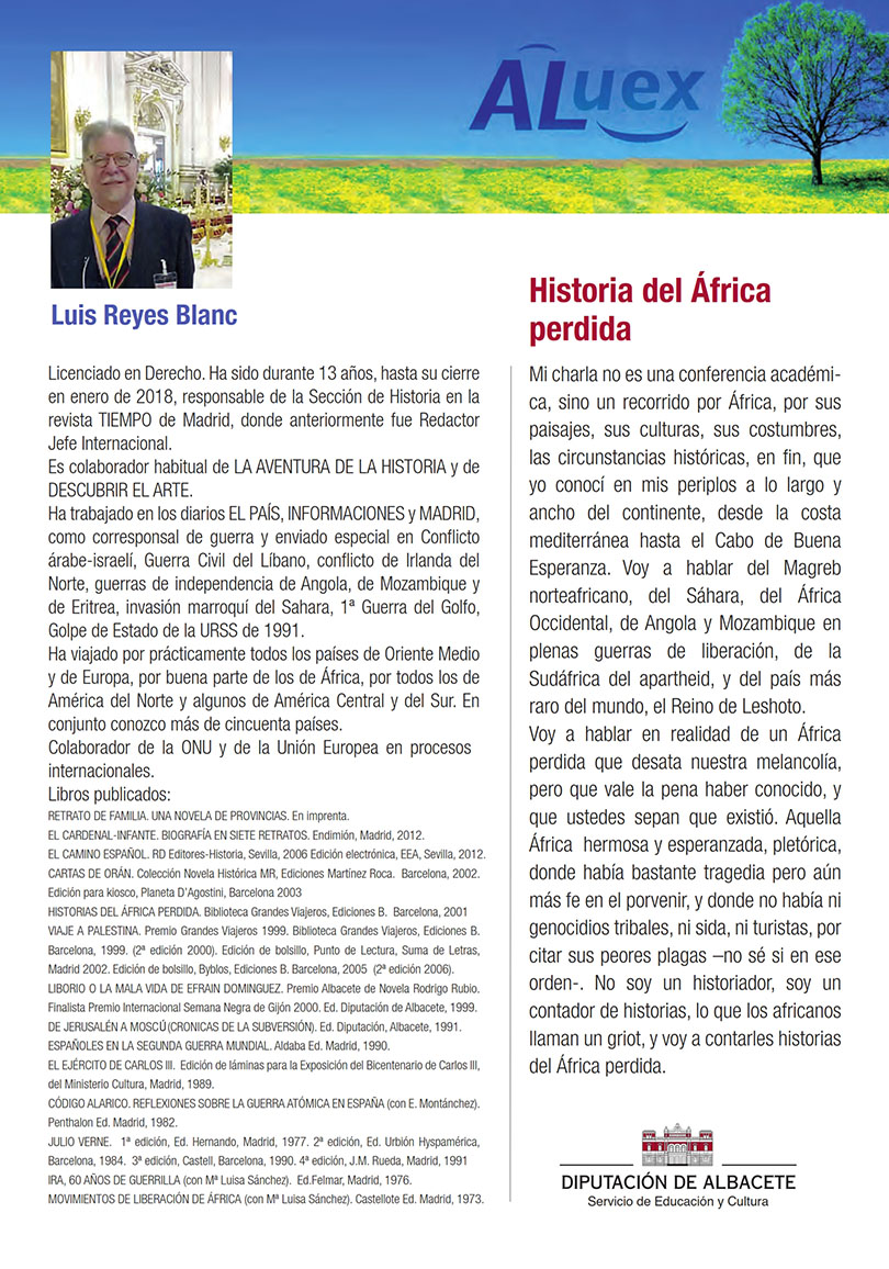 “HISTORIA DEL AFRICA PERDIDA”. D. Luis Reyes Blanc Periodista y Escritor. Hoja informativa de la conferencia