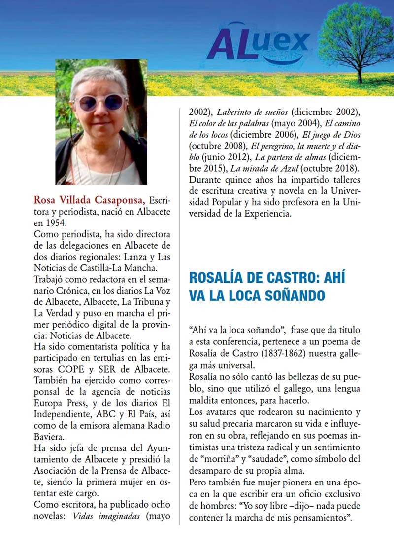 Conferencia número 15 18 de febrero: ROSALÍA DE CASTRO: “AHÍ VA LA LOCA SOÑANDO”. Dña. Rosa Villada Casaponsa. Escritora y Periodista . Ver boletín de la conferencia