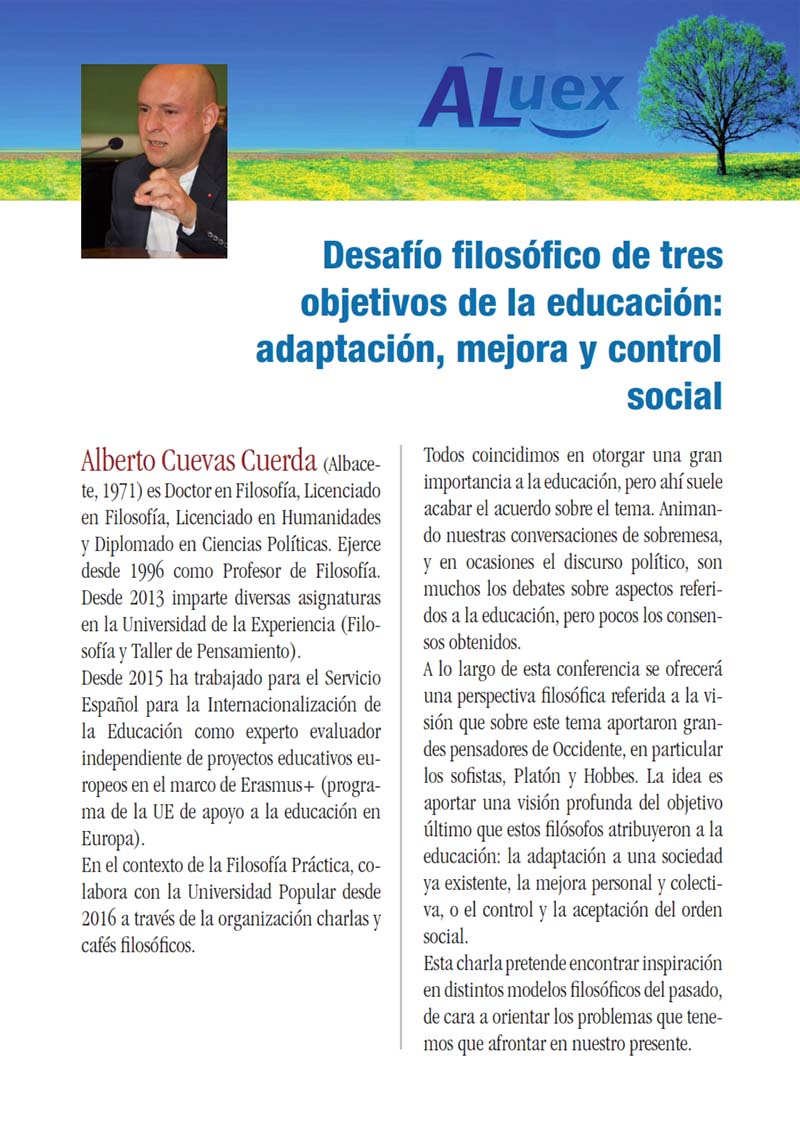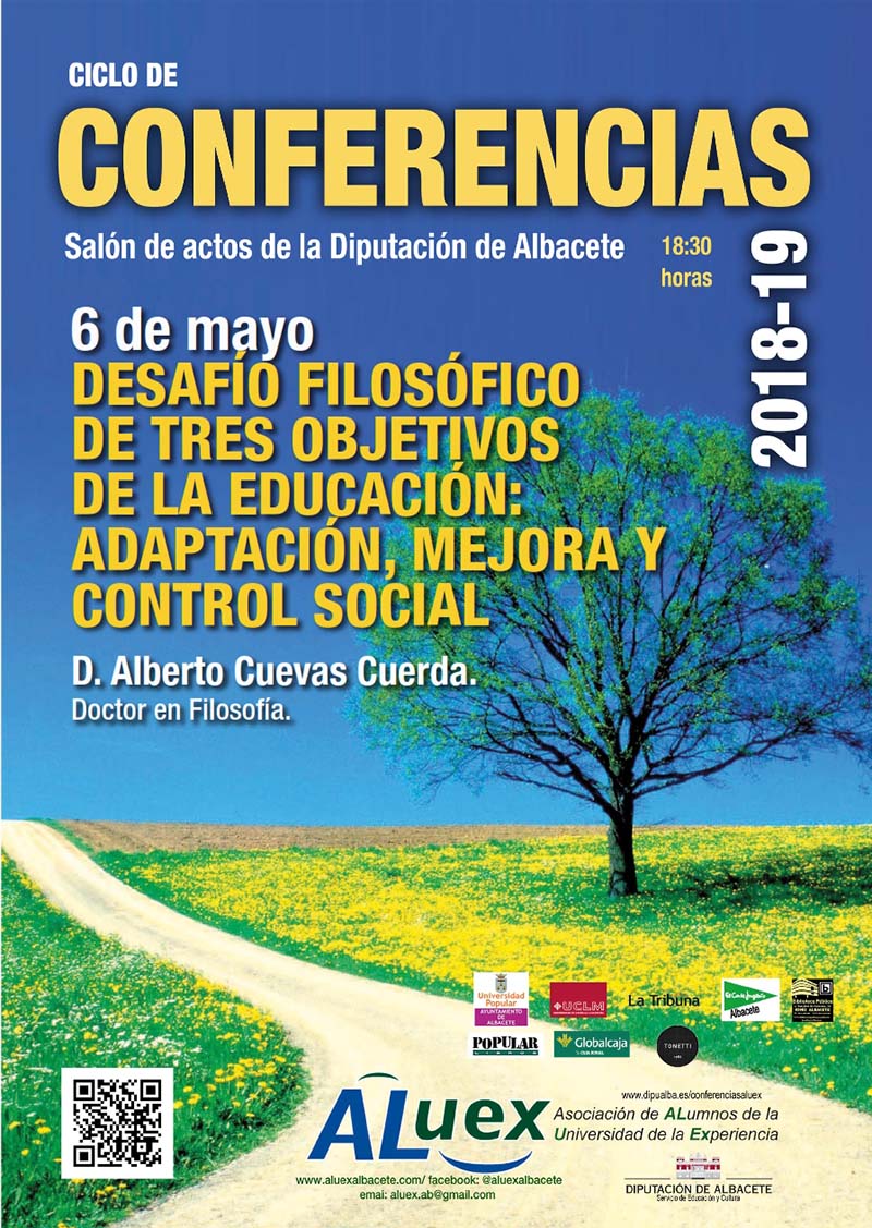 Conferencia número 24 6 de mayo: “DESAFÍO FILOSÓFICO DE TRES OBJETIVOS DE LA EDUCACIÓN: ADAPTACIÓN, MEJORA Y CONTROL SOCIAL”. D. Alberto Cuevas Cuerda. Doctor en Filosofía.