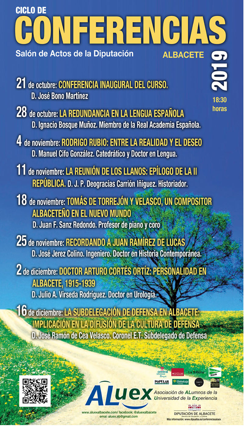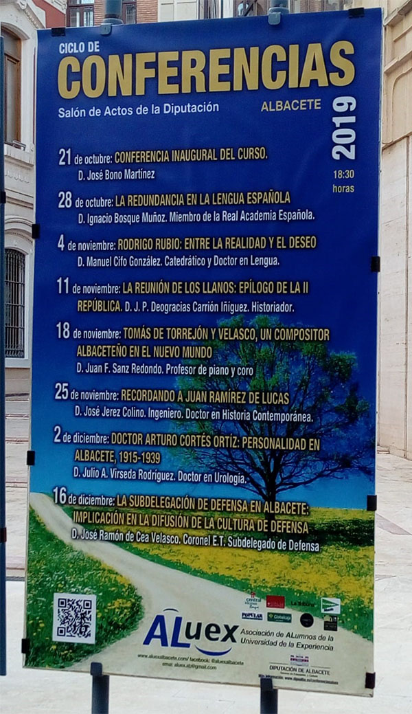 21 de septiembre 2019. CARTEL DE LAS CONFERENCIAS 2019SITUADO EN LA DIPUTACION PROVINCIAL DE ALBACETE.Ya se puede ver el cartel anunciando las conferencias de Aluex programadas para el año 2019.