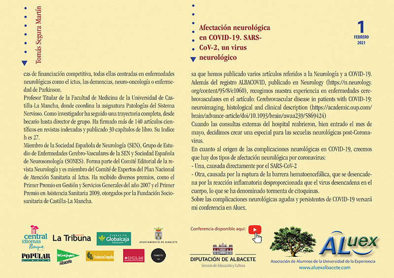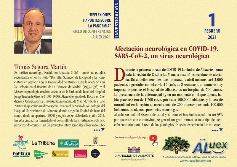 1 de febrero 2021. Video Conferencia número 03. REFLEXIONES Y APUNTES SOBRE LA PANDEMIA. "AFECTACIÓN NEUROLÓGICA EN COVID-19. SARS-COV-2, UN VIRUS NEUROLÓGOCO". Don Tomás Segura Martín. .Neurólogo
