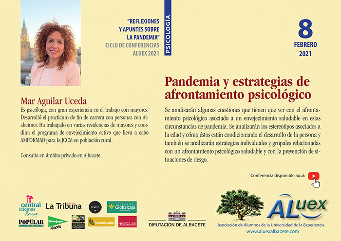 8 de febrero 2021. Video Conferencia número 04. REFLEXIONES Y APUNTES SOBRE LA PANDEMIA. "Pandemia y estrategias de afrontamiento psicológico". Dña. Mar Aguilar Uceda. Psicóloga