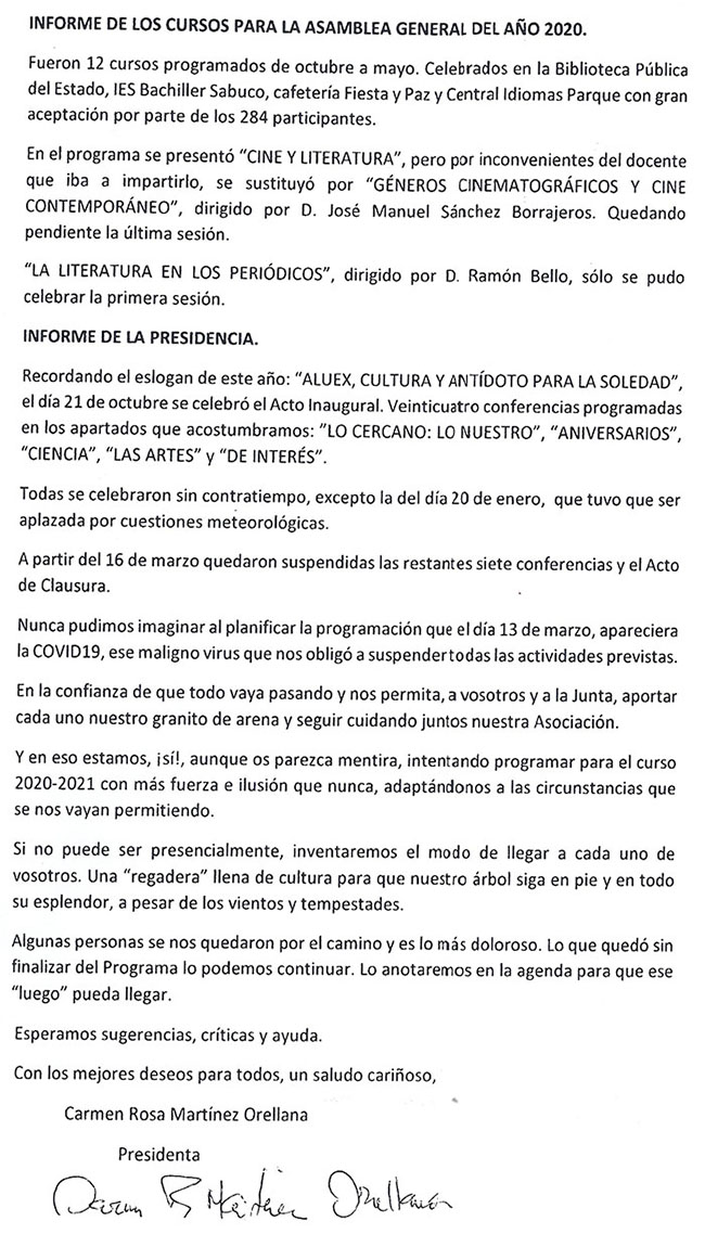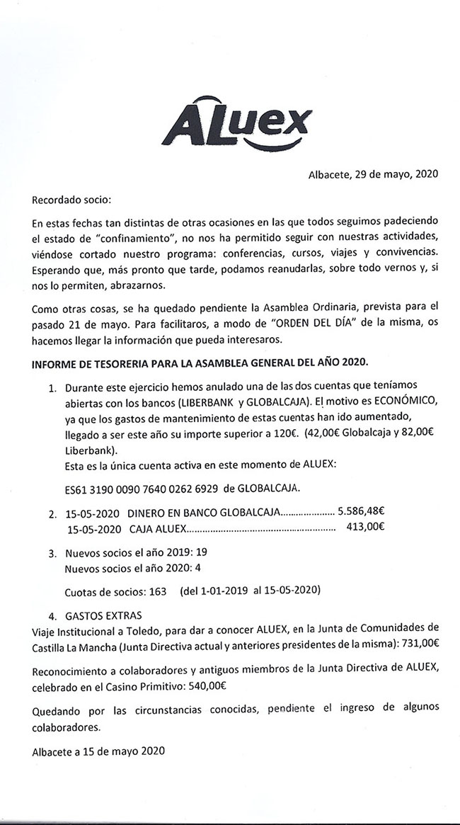 CARTA ENVIADA A LOS SOCIOS POR LA ASAMBLEA GENERAL 2020