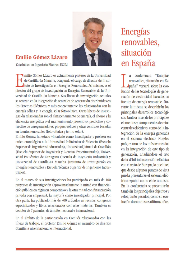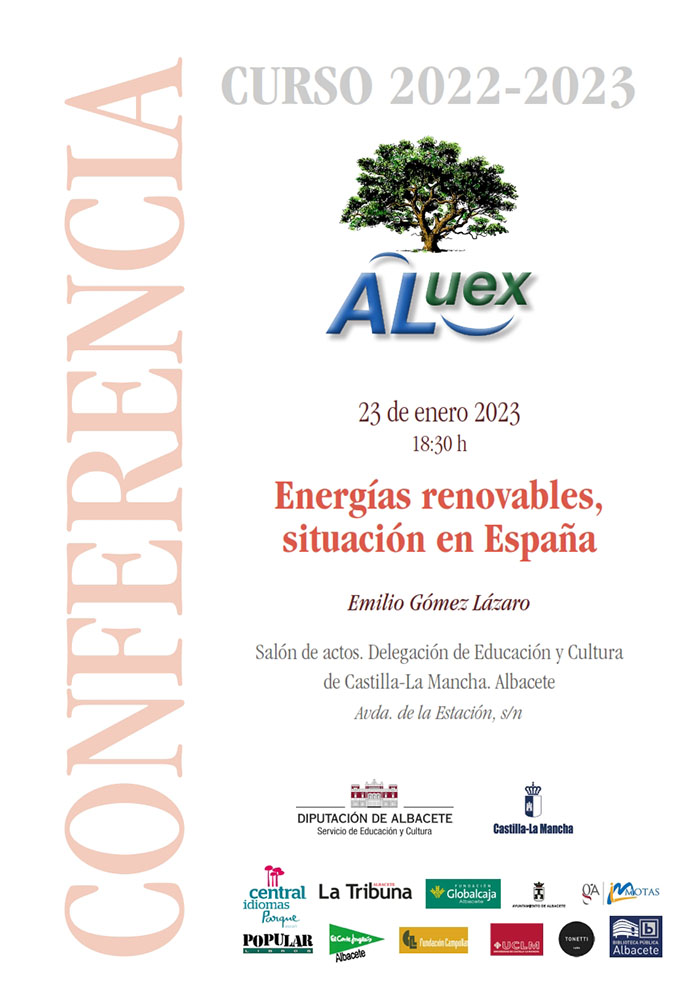23 de enero 2023. Conferencia número 10: ENERGÍAS RENOVABLES, SITUACIÓN EN ESPAÑA. Emilio Gómez Lázaro. Catedrático en Ingeniería Eléctrica UCLM.