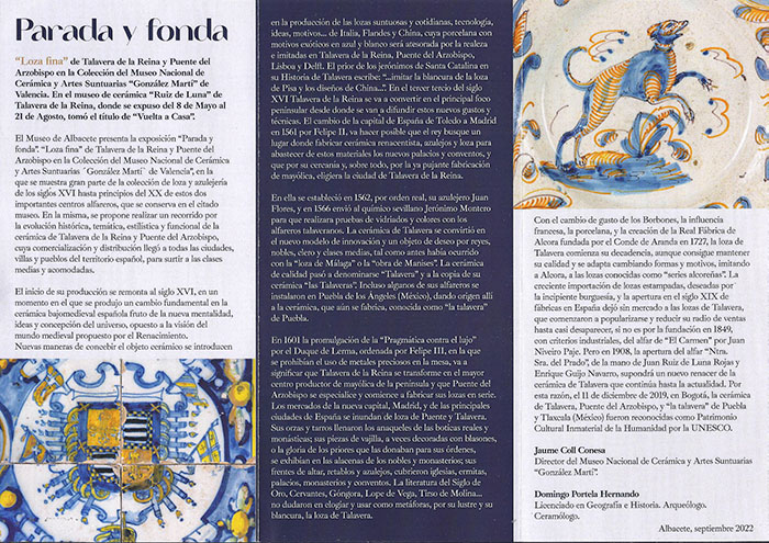 Se tiene prevista una visita al Museo de Albacete el día 1 de diciembre a las 10 de la mañana para contemplar la exposición temporal Parada y fonda: “Loza fina” de Talavera de la Reina y Puente del Arzobispo.