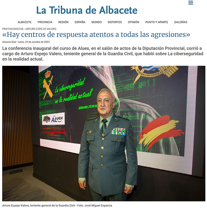La conferencia inaugural del curso de Aluex, en el salón de actos de la Diputación Provincial, corrió a cargo de Arturo Espejo Valero, teniente general de la Guardia Civil, que habló sobre La ciberseguridad en la realidad actual. El teniente general y jefe del Mando de Apoyo de la Guardia Civil, natural de El Ballestero, comentó a La Tribuna de Albacete distintos aspectos de su intervención, en un salón de actos que se llenó. ¿La ciberseguridad es uno de los grandes problemas en la sociedad actual? La ciberseguridad es un problema que nos afecta a todos los niveles, particular, empresa y seguridad nacional. Realmente, a nivel particular, de familia nos afecta, porque nos roban la intimidad, la privacidad y nuestra economía. Escalamos en cuestión de empresa, nos quitan el I+D, se nos adelantan, con lo cual, el tema de lo que pensábamos, que Europa iba a estar en el centro de la investigación y desarrollo y que Asia-Pacífico iba a ser la zona manufacturera, vemos que realmente ellos han avanzado muchísimo y nosotros, Europa, en I+D, hemos retrocedido y, encima, tenemos que protegerlo, porque si no es así, tendremos un problema a la hora de mantener una estabilidad en lo que es la seguridad económica, como elemento de la seguridad nacional. A nivel de Estado, ¿es imposible la total seguridad? Es imposible. Cuando se utiliza tanto la palabra resiliencia, quiere decir que, antes o después, nos van a atacar o nos pueden eliminar un sistema o neutralizarlo. Tenemos que tener los elementos suficientes, con copia de seguridad, para poder volver a un estado anterior y seguir nuestra vida normal, pero realmente, afecta mucho al Estado. La soberanía de un Estado se representa sobre un territorio, vemos las Fuerzas Armadas, el Ejército de Tierra, el de Aire-Espacio, la Armada y nos ha salido un elemento nuevo, el ciberespacio, donde el control es mucho más difícil. A partir de ahí, todos los movimientos de economía se desplazan por esa zona, casi invisible y que el Estado en sí, tiene limitaciones a la hora de ejercer su soberanía. Si nos roban los datos, por ejemplo, puede ser alguien de China, nuestros datos están en Irlanda y nosotros somos de España. El tema de poder detener al agresor, es muy complicado. ¿Las Fuerzas de Seguridad pueden protegernos a esos niveles? Me gusta hablar más que de defensa, de seguridad, porque estamos todos implicados, desde las Fuerzas Armadas a cualquier ciudadano, estamos todos, porque estamos hablando de todos los elementos que componen la seguridad nacional, empezando por el ciberterrorismo, seguridad económica, que es muy importante. Ya no hace falta invadir un país, si lo tumbas económicamente, lo dejas fuera de combate. Hay centros de respuesta que están atentos a todas las agresiones, que tienen una respuesta rápida para lo que son infraestructuras críticas o esenciales, como electricidad, sanidad o transporte y la reacción tiene que se muy rápida. ¿Estamos preparados? Se empieza a estar. Nos ha costado, porque hemos visto que hay un retraso respecto a Estados Unidos, del orden de 15 años, ya le estaban encriptando a los hospitales sus sistemas y pensábamos que era una cosa de otros, que no iba a ocurrir en España, y vemos que encriptan ayuntamientos, hospitales, es un tema económica y también de seguridad. La agresión no sabes de dónde te viene, puede ser de un particular o de un Estado. Se puede espiar , incluso, a la máxima autoridad de un Estado? Ahora mismo los sistemas son vulnerables. Tienen que ser continuamente revisados por personal muy especialista y además, un jefe de Estado debe llevar exclusivamente lo que necesite. Me explico, si se construye una casa con muchas ventanas, la agresión puede ser por cualquiera. Hay que hacer una casa sólo con una puerta y blindada y, si no necesitas ventanas, no se ponen. Si te bajas muchas aplicaciones, cualquiera de ellas, puede hacer que tu dispositivo sea vulnerable. ¿Qué aconsejaría a la gente normal, al ciudadano? Aconsejaría sentido común, tan sencillo como esto. Hay que tener actualizaciones del sistema operativo, por ejemplo, antivirus, cortafuegos. Con una serie de medidas básicas, podemos estar más o menos seguros, pero no es lo misma proteger a un particular o a una empresa. | ||||