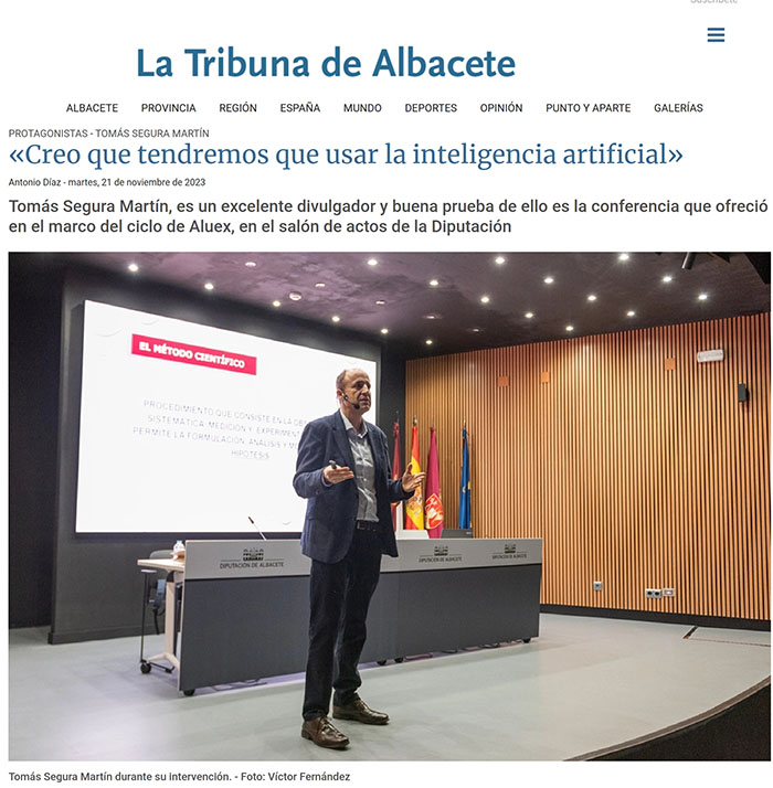 20 de noviembre 2023. CIENCIA E INVESTIGACIÓN Ponente: Tomás Segura Martín. Tomás Segura Martín, médico neurólogo, con numerosos galardones, además de dirigir un equipo de investigación con una gran proyección, es un excelente divulgador y buena prueba de ello es la conferencia que ofreció en el marco del ciclo de Aluex, en el salón de actos de la Diputación. El doctor Segura Martín, actualmente en el Hospital Universitario de Albacete, donde está al frente de la Unidad de Ictus, habló sobre Investigación clínica: Perspectiva en un médico neurólogo. De nuevo divulgación medica, algo que también define su trayectoria... He hablado en muchas ocasiones, en Albacete y fuera de Albacete, en foros que no son médicos, lo que entendemos por hacer divulgación científica o de mi especialidad, pero es verdad que lo he hecho siempre sobre temas que interesan mucho más a la gente de la calle, porque están relacionados con enfermedades, y esto siempre llama la atención. Aluex me pidió una conferencia, sobre el método científico, que he intentado hacer ameno. Como se suele decir en ocasiones, ¿es la investigación la madre del cordero? He intentado es llevar a la audiencia la información, el conocimiento, de cómo llegó al mundo la investigación y cómo llegó a la Medicina, porque no llegó en primer lugar, ni mucho menos, a la Medicina. La Medicina, el problema o la virtud que tiene es que siempre se ha dicho que es un arte y el arte y la ciencia no tienen mucho en común. Entonces, sin la ciencia no tendríamos el nivel de vida que hemos adquirido, evidente, y la Medicina se ha pegado mucho a la ciencia más recientemente, que otras disciplinas. El apego de la Medicina a la ciencia tiene enormes ventajas, pero también algún inconveniente. Ciencia es, por supuesto. La Medicina es una ciencia, pero es una ciencia sometida a una enorme variabilidad que no tienen probablemente otras disciplinas como la Física. Cuando tú atiendes a un paciente, en su sanación influyen muchas otras cosas, que han dado lugar a esta confrontación. Porque somos únicos... Grandes pensadores a lo largo de la historia han mantenido que esa es la principal dificultad para hacer de la Medicina una ciencia, la enorme variabilidad que hay entre especies e influyen otras cosas a la hora de homogeneizar. Influyen los condicionantes del paciente y los del médico, el día que tenga cada uno. La tecnología también ayudará en la precisión. Sí, la Medicina va a cambiar mucho en los próximos años con el advenimiento de la inteligencia artificial. La inteligencia artificial funciona por algoritmos y tiene un desarrollo puramente objetivo. Esto nos va a ayudar mucho, pero también tiene peligros. ¿Por ejemplo? Cuando un médico con unos años de profesión y con una cierta capacidad social o de empatizar se enfrenta a un paciente y le pide información, el paciente se la da, trasformada por él, con lo que cree que puede o debe decir. Si soy un ordenador, un robot, no voy a se capaz de percibir que, a lo mejor, una niña o una adolescente, no está dando la información precisa porque su madre está delante. Esa es la cuestión, si un robot que se maneja por algoritmos, puede tener la misma capacidad que el cerebro humano, que no sólo tiene una capacidad analítica muy grande, sino también social y emocional que es, por cierto, lo que nos ha dado el triunfo como especie. Ese es el problema, si un robot te hace una pregunta y la contestas incorrectamente, se va por una zona del laberinto, del algoritmo, que es incorrecta, pero no se plantea que el paciente le está dando mal la información. ¿Será entonces una herramienta más para el médico? Efectivamente, creo que tendremos que usar la inteligencia artificial, porque la Medicina ahora mismo está colapsada y si no conseguimos que haya un primer barrido, un porcentaje del 20, 30 por ciento, de todos los pacientes que pidan consulta sean filtrados a través de máquinas de inteligencia artificial, no vamos a llegar a todos. En mi consulta en el Hospital, recibo una enorme cantidad de peticiones para que las filtre, pero claro, las tengo que filtrar con la escasa información que me da el médico de atención primaria y así es muy difícil saber si el paciente puede tener algo grave o no y va a necesitar atención en dos semanas o va a pasar a la demora que ahora tenemos de más de seis, ocho meses, de primera visita, pero la inteligencia artificial puede estar filtrando estas solicitudes directamente con el paciente, interactuando con él. | ||||
