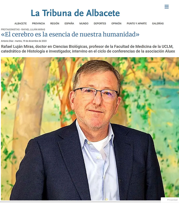 18 de diciembre 2023.. CIENCIA E INVESTIGACIÓN Rafael Luján Miras, doctor en Ciencias Biológicas, profesor de la Facultad de Medicina de la UCLM, catedrático de Histología e investigador, intervino en el ciclo de conferencias de la asociación Aluex. Habló en el salón de actos de la Diputación sobre El cerebro humano: Ese gran desconocido. ¿Por qué decimos que el cerebro humano es un gran desconocido? Realmente se sabe muy poco. De hecho, es el órgano de nuestro cuerpo del que menos información se tiene. No cabe duda de que, desde la época de Ramón y Cajal, que fue quien fundó la neurociencia moderna, tal como la conocemos hoy en día, el conocimiento sobre el cerebro ha avanzado muchísimo y se dispone de muchísima información. Llevamos varias décadas en el que el estudio del cerebro se ha abordado desde muchísimas perspectivas, desde el punto de vista molecular, genético, de comportamiento, fisiológico, anatómico, histológico, etc., y todo esto ha aportado una información valiosísima y aún así, somos grandes desconocedores de cómo funciona el cerebro, que está formado por unas 180 regiones nerviosas diferentes, cada una con una función diferente y no se conocen cuestiones básicas, por ejemplo, cómo se produce una enfermedad. ¿Nos puede poner algún ejemplo? No se sabe cómo es el inicio de la enfermedad de Alzheimer. Sabemos muchas cosas, pero, entre otras cosas, no tiene cura porque no sabemos cómo se inicia. No sabemos cómo se recuperan los recuerdos de nuestra memoria y no se sabe cómo llevamos a cabo los procesos de pensamiento diario. Muchos comportamientos tampoco se sabe cómo se inician. Es decir, cuestionas básicas sobre lo que somos como humanos, se desconocen por completo. La esencia del ser humano, ¿está en el cerebro? Claro, el cerebro es la esencia de nuestra humanidad. Lo que nos diferencia de otros mamíferos es precisamente la evolución que se ha llevado a cabo de nuestro cerebro. Nuestro cerebro es lo que nos hace ser humanos; ahí es donde realmente radicaría lo que comúnmente llamamos el alma. El alma no es otra cosa que lo más íntimo de nuestra humanidad, que radica en el cerebro. ¿Estamos dando aún los primeros pasos para el conocimiento o el avance es ya muy importante? Los primeros pasos ya se empezaron a dar hace más de 100 años con Ramón y Cajal. Se han dado, como digo, muchísimos pasos, pero nos quedan por dar muchísimos más hasta que lleguemos a comprender realmente cómo funciona nuestro cerebro, que va cambiando minuto a minuto. Una de las características que tiene nuestro cerebro, que ya fue descrita por Santiago Ramón y Cajal, es que nuestro cerebro es plástico, está continuamente, adaptándose al entorno, a las necesidades y gracias a que el cerebro es plástico, va evolucionando y madurando. Toda esa plasticidad hace muy difícil abordar, a día de hoy, el estudio del cerebro, aunque se está avanzando con muchísimas técnicas, sobre todo a los dos macroproyectos para su estudio, uno es el europeo, Human Brain Project, y el otro es el americano, parecido, Brain. Gracias a esos proyectos se ha avanzado muchísimo en los últimos años, pero incluso así, todavía estamos muy lejos de conocer cómo realmente funciona nuestro cerebro. ¿Es muy parecido, por ejemplo al del chimpancé? El cerebro que evolutivamente más se parece al humano es del chimpancé. Se empezaron a separar evolutivamente chimpancés y humanos hace seis millones de años. No cabe ninguna duda de que el chimpancé es un animal muy inteligente, puede aprender un montón de cosas, pero tiene muchas limitaciones. Eso se traduce en que el cerebro humano tiene unas características que, de momento, nos hace únicos. Como especie, ¿el cerebro continúa su evolución? Sin duda, desde el momento en que nuestro cerebro es plástico, eso quiere decir que se está adaptando al entorno y la evolución no es otra cosa que adaptación al entorno. Por tanto, nuestro cerebro está continuamente evolucionando. ¿Hasta dónde llegará?, veremos, pero nuestro cerebro se caracteriza por ser plástico, por estar continuamente en movimiento y evolucionando.