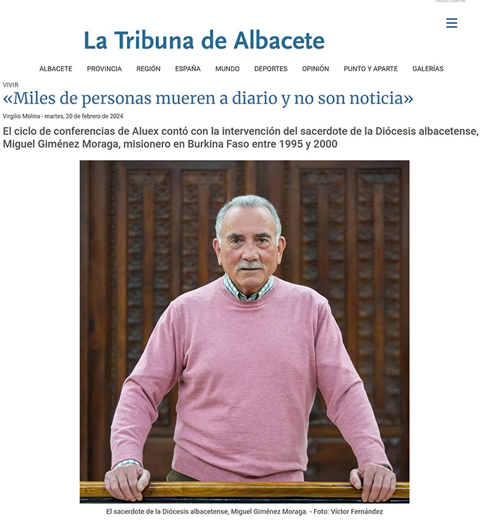 19 de febrero 2024. ALBACETE SOLIDARIO Una valiosa línea de ayudas que se remonta en el tiempo ya varias décadas. Sí, la relación establecida entre nuestra Diócesis y Burkina Faso se traduce en nuestra labor como misioneros durante 25 años en este país africano, concretamente en Safané, una colaboración que se llevó allí directamente y también desde Albacete. Una colaboración muy importante desde el punto de vista educativo, ¿ no es así? Nosotros hemos posibilitado, entre otras cosas, un instituto de Enseñanza Media y alrededor de 3.000 plazas escolares desde 1998, aunque la colaboración también se extiende a otros ámbitos, sé que la Diócesis de Albacete colabora económicamente en adquirir motocicletas para que los curas nuevas puedan desplazarse por los pueblos o en el arreglo de edificaciones, concretamente a través de mí se vehicularán este año en torno a 12.000 euros de ayudas a familias y para apoyo educativo. En su caso también ha dedicado su tiempo al asesoramiento de inmigrantes subsaharianos en Albacete. Más que asesorar les acompaño desde que volví de Burkina Faso en el año 2000, una labor de acompañamiento y acogida de estos inmigrantes para ayudarles en mil y una situaciones. En Malí también visité en 1998 y 1999, junto a un matrimonio de Albacete, a decenas de familias de los chicos a los que conocí y acompañé aquí, dando un poco razón de ser de sus hijos en nuestra tierra. Esa solidaridad, ¿se antoja si cabe más necesaria hoy en día por el agravamiento de la situación en muchos países del continente? De hecho parte de nuestra colaboración, como le dije, consiste en aumentar el número de plazas escolares con el fin de que la gente esté más formada, posibilitando que no tengan necesidad de dejar su país y evitar una peligrosa travesía, aunque en países como Burkina Faso, Níger o Malí el terrorismo está arruinando a unas poblaciones que ya eran pobres de por sí. ¿Qué fue lo que más le impacto en su labor misionera? No sabría decir, cuando viajé a Burkina por primera vez caí en la cuenta de que debía ponerme unos tirantes en el alma, aunque a mí nunca se me cayó el alma al suelo, porque no podía dejarme abatir por las múltiples situaciones de miseria y necesidades, sí que me impacto lo acogedera que es aquella gente y su conformismo, en la medida en que hasta finales de los años 90 no conocían otra cosa. Basta hacernos una radiografía en el corazón para comprender que el Primer Mundo vive en muchos aspectos gracias a los que se les expolia a estos países y luego se les manda en el mejor de los casos un 0,7% miserable a modo de dádiva. Tengo muchas experiencias impactantes, por ejemplo cuando llegué a Burkina Faso había un niña, hija de un colaborador de una de las misiones, que nació con una pierna desencajada y a los dos años estaba muy triste, inútil, tirada en el suelo y, gracias a la labor de la misión, cuando a los cincos años regresé se quedó saltando y riendo. ¿Es preciso potenciar la labor de sensibilización en nuestra sociedad respecto a esas carencias? Sí, a la población europea en general, por ejemplo cuando hace años asesinaron a un misionero español en la frontera de Malí toda la prensa se volcó en el suceso, pero después las miles de personas que mueren casi a diario no son noticia, porque, entre comillas, no son de los nuestros; no obstante sí puede asegurar, por ser testigo en primera personas, de que existe una gran solidaridad en bastantes personas de a pie hacia aquellas gente, no tanto de las instituciones.
