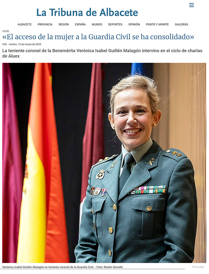 El ciclo de conferencias promovido por la Asociación de Alumnos de la Universidad de la Experiencia (Aluex) contó con la intervención de la teniente coronel de la Guardia Civil, Verónica Isabel Guillén Malagón, estrechamente vinculada con Albacete (nació en Madrid, aunque pronto pasó a residir en la capital albacetense con su familia), que habló sobre los 36 años cumplidos de la incorporación de la mujer a las Fuerzas Armadas y a la Guardia Civil. La ponente está destinada actualmente en la Dirección General de la Benemérita, en Asuntos Internos, y es una de las pocas mujeres que ostenta el empleo de teniente coronel del instituto armado.