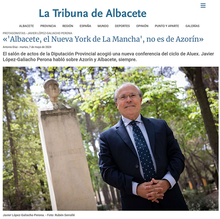 El salón de actos de la Diputación Provincial acogió una nueva conferencia del ciclo de Aluex. Javier López-Galiacho Perona habló sobre Azorín y Albacete, siempre. El presidente de Amithe y académico de número de la Real Academia Europea de Doctores comentó a La Tribuna de Albacete distintos aspectos de su intervención sobre José Martínez Ruiz, Azorín.