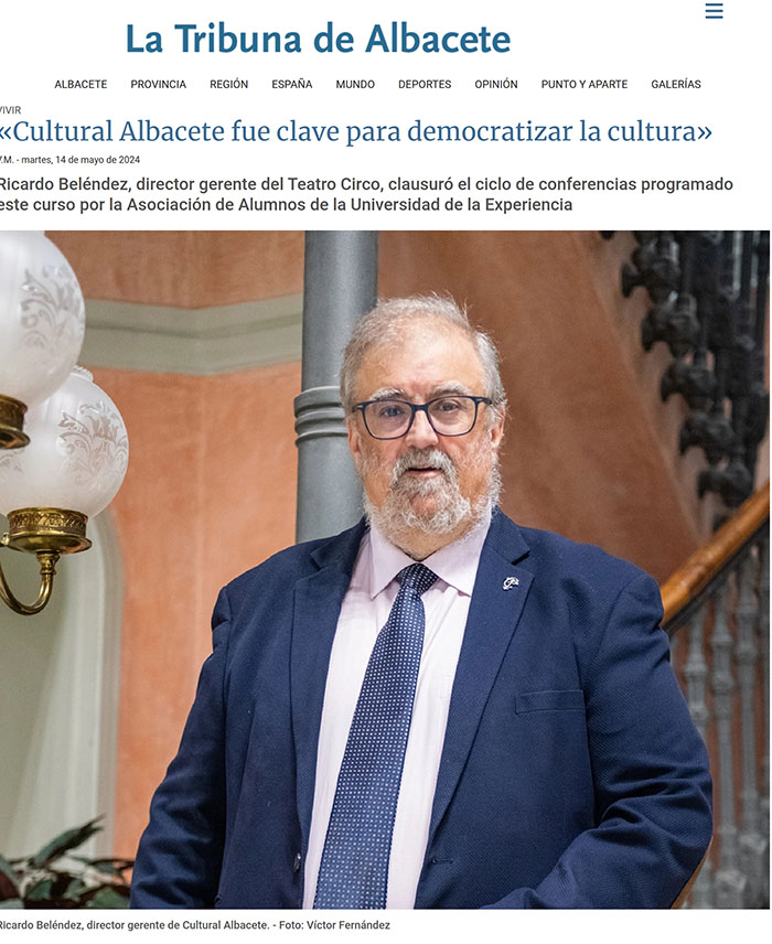 13 de mayo 2024. Cultural Albacete: 40 años de historia, Entrevista en el periódico La Tribuna de Albacete: Una creación que supuso un antes y un después en material cultural, ¿no es así? Absolutamente, porque antes de su creación se programaban representaciones en el Teatro Circo durante la Feria o en la Festivales, pero las grandes exposiciones y estrenos, los ponentes de renombre, la programación de música regular, el encuentro con grandes literatos -que llegó a determinar el gran desarrollo de la poesía en Albacete-, la creación del Teatro de la Paz... todo ello supuso un cambio radical, no tiene nada que ver el panorama cultural de la ciudad con el existente antes de su nacimiento; otra gran diferencia con respecto a sus inicios es haber llegado a los 87 municipios de la provincia, sin duda podemos decir que ha sido clave en la democratización de la cultura. Cabe destacar el respaldo decisivo que ha conseguido entre los ciudadanos... Sin duda, eso nos permite que con una baja financiación pública pueda desarrollarse tanta actividad cultural, porque tenemos al público apoyándonos, como reflejan las estadísticas, y seguimos siendo referentes en ese sentido. A pesar de ello, el Consorcio vivió una situación crítica en a finales de los años 90. Sí, una crisis que estuvo al borde de provocar su desaparición. Coincidió con la presidencia de Emigdio de Moya en la Diputación y con el nombramiento de otro director gerente, la salida de los ayuntamientos consorciados, una deuda acumulada, la marcha de Juan Pedro Aguilar... no sé si fueron cuestiones técnicas o también políticas, por fortuna ahora vamos de la mano y hay un gran pacto entre todos los partidos en torno a Cultural y los acuerdos se toman normalmente por unanimidad, ese consenso en cultura es fundamental y favorece mucho toda esa actividad y la programación. Mención aparte merece además el desarrollo de eventos paralelos como el Festival Internacional de Circo, el certamen de música barroca o los circuitos provinciales... Así es, Juan Pedro Aguilar creó el primer festival, el de Chinchilla, que cuando yo llegué se tranformó y orientó como de teatro clásico; después vino el Festival Internacional de Circo, el Festival de Música Barroco o los llamados Circuitos Diminutos, de carácter provincial, que permitió llevar la cultura a todos los rincones. Personalmente, ¿qué le ha supuesto dirigir los destinos de Cultural Albacete durante tantos años? Cuando vine como invitado a la reinauguración del Teatro Circo, por entonces yo era director de la Fundación de Cultura y Deporte de Castilla-La Mancha, me quedé asombrado de esa joya y también muy emocionado, porque mi padre aprendió a poner cine aquí, con uno de los proyectistas; posteriormente, cuando estaba en la organización de una exposición en Bruselas y con el homenaje a Buero Vallejo en Almagro, recibí una llamada para hacerme cargo de Cultural Albacete y del Teatro Circo, por la renuncia de López Ariza, y no dudé en aceptar regresar a mi casa para gestionar cultura, que es mi gran vocación. En este tiempo estuve como vicepresidente de la Red de Teatros, en la junta directiva de los teatros de ópera, en la comisión ejecutiva del Ministerio de Cultura... además he podido a conocer personalmente a nombres de la talla, de Concha Velasco, El Brujo, José Sacristán, Juan Mayorgala, la familia Isbert... con los que he tenido una cercanía enorme, todo esto ya no es algo profesional, se traslada a lo personal. Ahora que se aproxima al final de su vida laboral, ¿qué perspectivas de futuro le ve a Cultural Albacete? Le veo mucho futuro, cada vez creo que será más esencial la cooperación entre administraciones y el ámbito privado para extender o comarcalizar cultura, procesos que hemos consolidado en este tiempo.