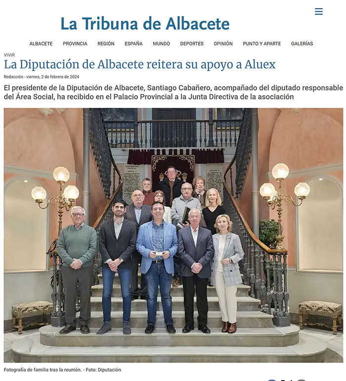 El presidente de la Diputación de Albacete, Santiago Cabañero, acompañado del diputado responsable del Área Social, ha recibido en el Palacio Provincial a la Junta Directiva de la Asociación de Amigos y Alumnos de la Universidad de la Experiencia (ALUEX), encabezada por su presidente, Juan José Caravaca. Un encuentro en el que le han hecho entrega de la última Memoria de Actividades de la entidad, aprovechando para reiterarle su profundo agradecimiento por "el continuo respaldo" que les viene brindando la institución provincial, destacando la colaboración para acoger el prestigioso Ciclo de Conferencias que, cada lunes, ALUEX ofrece y al que, además de 'casa', la Diputación le presta diverso apoyo logístico. En un esfuerzo por hacer que las conferencias sean accesibles para personas con discapacidades auditivas, durante este encuentro Caravaca ha planteado el deseo de la entidad de poder ofrecer una interpretación en lengua de signos de las citas. Una iniciativa "completamente alineada con el objetivo de democratizar el acceso a la cultura para todas las personas, especialmente para aquellas en situaciones de vulnerabilidad", que ha sido rápidamente acogida con entusiasmo por el presidente provincial. Santi Cabañero se ha comprometido a respaldar esta propuesta, asumiendo la responsabilidad de facilitar y promover esta iniciativa hasta el final del curso de conferencias. La colaboración entre ALUEX y la Diputación de Albacete es ejemplo destacado de un esfuerzo conjunto para garantizar que la cultura, el saber y el conocimiento estén al alcance de todas las edades y del conjunto de la ciudadanía, sin importar sus circunstancias. Esta asociación ha sido reconocida como un agente dinamizador de la vida social y cultural de Albacete, contribuyendo significativamente al impulso de la cultura y al fomento de la participación ciudadana. Esta reunión ha sido un testimonio más de la visión compartida de ambas entidades para promover la inclusión y la accesibilidad en el ámbito cultural, afianzando una colaboración que, han coincidido, a través del saber y de su divulgación, construye poco a poco una provincia más sólida y preparada. Copia total de la noticia aparecida en el periódico La Tribuna el día 3 de febrero 2024. |