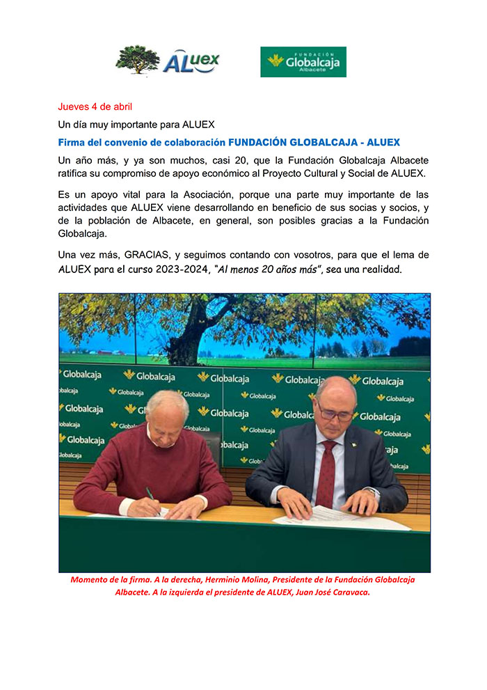 4 de abril 2024. FIRMA DEL CONVENIO DE COLABORACIÓN FUNDACIÓN GLOBALCAJA - ALUEX.