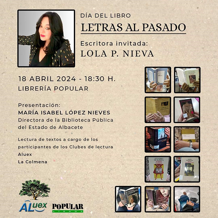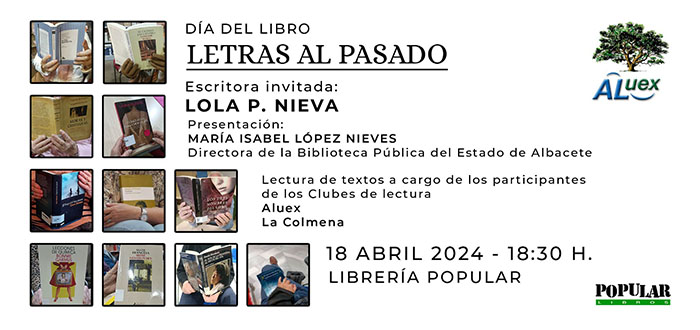 Para conmemorar el Día del Libro 2024, Aluex y la Librería Popular celebraron, conjuntamente, un Encuentro Literario bajo el título "Letras al pasado" y donde participaron la escritora albaceteña Lola P. Nieva y Mª Isabel López Nieves, Directora de la Biblioteca Pública del Estado de Albacete; también intervinieron distintos integrantes de los Clubs de Lectura "La Colmena" y "Aluex".