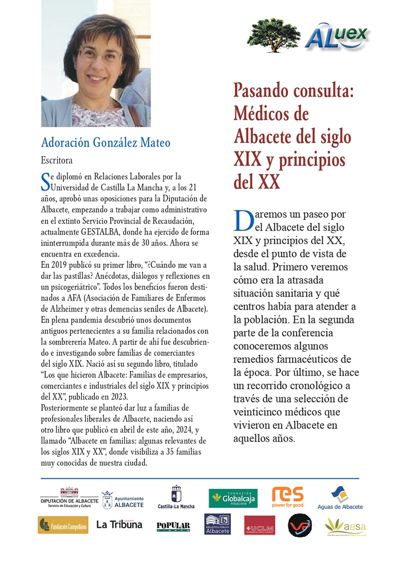 Conferencia número 2. PERSONAJES QUE HAN FORJADO LA HISTORIA DE ALBACETE. PASANDO CONSULTA: MÉDICOS DE ALBACETE DE FINALES DEL SIGLO XIX Y PRINCIPOS DEL XX. Adoración González Mateo. Escritora.