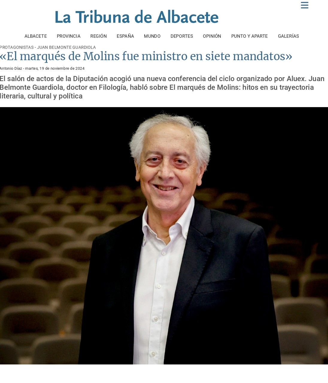 18 de noviembre 2024. Entrevista en el periódico La Tribuna de Albacete: El salón de actos de la Diputación acogió una nueva conferencia del ciclo organizado por Aluex. Juan Belmonte Guardiola, doctor en Filología, habló sobre El marqués de Molins: hitos en su trayectoria literaria, cultural y política. ¿Por eligió hablar sobre el marqués de Molins en este ciclo de Aluex? Primero, desde niño, al pasar por la calle Marqués de Molins sentía curiosidad, entonces preguntaba quién era este señor y leí sobre él en enciclopedias. Luego, cuando me muy a estudiar Filología aparecía en algunos textos de literatura y fue más grande todavía mi interés por el marqués de Molins. Terminé la licenciatura y después hice la tesis doctoral sobre parte de su obra, sobre su obra periodística, sobre todo algunos artículos que no estaban recogidos en sus obras. Tiene siete volúmenes pero estos artículos que recogí no los tenía incorporados. Pero siguió investigando al personaje. Efectivamente, seguí investigando y salen cosas muy interesantes porque el personaje abarca aspectos de la vida social, política y, por supuesto, cultural. Un personaje digno de estudiar por los historiadores, por los políticos, sin duda o literatos. El marqués de Molins tiene una actividad muy intensa y, desde luego, no ya en Albacete, que se conoce lo más elemental, pero los grandes historiadores españoles apenas le dedican unas líneas. Fue ministro... Claro, hay que tener en cuenta que el marqués de Molins fue ministro en siete mandatos. Fue director de la Real Academia Española de la Lengua e intervino en acontecimientos muy importantes, es más, cuando Isabel II llega al poder, le pide consejo al marqués de Molins y hay muchas cartas sobre ello, en asuntos tan importantes como la educación de su hijo. Quiere que sea el tutor en Inglaterra o en Austria del príncipe Alfonso, futuro Alfonso XII, que en su primer Gobierno lo nombra ministro de Marina. Acompañó al rey. Sí, fue el que acompañó a Alfonso XII, ya proclamado rey algunos días, a Marsella a Barcelona, Valencia y Madrid. También Cánovas lo nombra embajador en París para que, de alguna manera, controlase a los exiliados, incluso para evitar que los carlistas hicieran de las suyas. La labor que hizo durante cinco años fue muy importante. Sus actuaciones en todos los ámbitos de la vida durante 60 años, prácticamente, son muy importantes. ¿Una vida muy intensa? Sin duda, su vida fue muy intensa y es verdad que piensas en cómo pudo hacer tantas cosas bien. Era un enorme orador, destacaba tanto en sus intervenciones en el Congreso como en el Senado, portavoz del Partido Liberal Conservador durante muchísimos años y perteneció a la Real Academia de la Lengua, de la Historia, de las Ciencias Sociales y Políticas, a la de San Fernando y en todas intervino. Tiene obras de investigación muy importantes como La sepultura de Miguel de Cervantes y, precisamente en 2016 se hizo un estudio para ver si los restos estaban en Las Trinitarias, pues bien, hacía ya más de un siglo que el marqués de Molins publicó una obra, por encargo de la Academia, sobre la sepultura de Cervantes, un estudio muy pormenorizado, diciendo que no se habían movido los restos del lugar donde se enterraron, Las Trinitarias. Mariano Roca de Togores es un todo un personaje, con una altura intelectual y erudición enormes, apreciadas en su tiempo. Merece esa calle en la ciudad donde nació. Sí y creo que hace unos años en al Ayuntamiento alguien propuso quitarla, por lo del marqués, porque a veces confundimos la cuna con las obras, pero también he dicho que parece triste que no se haya dado el nombre de Marqués de Molins a un centro educativo o una institución cultural, dada su trascendencia en la historia de España, cultural y literaria. ¿Qué faceta es la más interesante de Molins? Pues, por mi especialidad, me interesé en principio por la faceta literaria. Acompañó a Larra, estuvo paseando con él el último día de su vida y hay artículos sobre el último paseo de Fígaro. Introdujo el romanticismo en España y se codeaba como literato con todos, aunque luego se dedica a la política, donde ocupó los puestos más importantes, incluso fue ministro de Estado. Hay albaceteños que han sido ministros, pero este personaje, el marqués de Molins fue ministro en diferentes ocasiones y ministerios y los que hablan sobre la Marina española exaltan la figura de Molins, incluso tiene una calle en El Ferrol. Transformó las Escuelas de San Fernando, El Ferrol y Cartagena, con una labor muy importante.