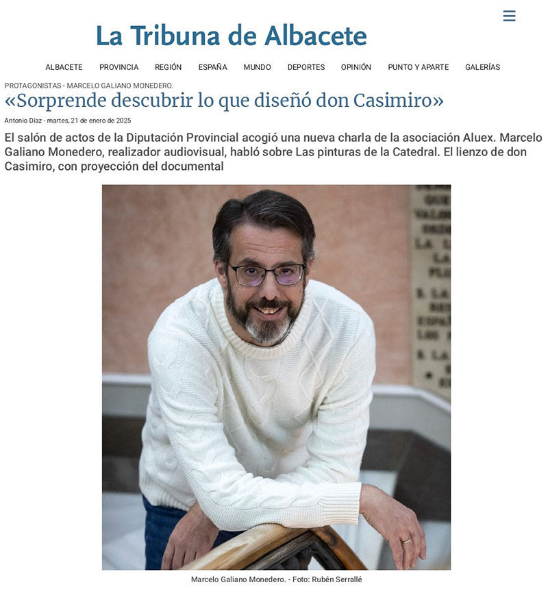 El salón de actos de la Diputación Provincial acogió una nueva charla de la asociación Aluex. Marcelo Galiano Monedero, realizador audiovisual, habló sobre Las pinturas de la Catedral. El lienzo de don Casimiro, con proyección del documental. ¿Es uno de sus documentales más singulares el de las pinturas de la Catedral? La verdad es que sorprende descubrir lo diseñó don Casimiro, porque realmente es grandiosa la historia que creó. Como vengo más del mundo del cine que del arte, me llamó muchísimo la atención el guión que diseñó, mezclando la Biblia, lógico en una Catedral, con historias de la posguerra, de los años 50 y los miedos de la época. Disfruté mucho haciendo este trabajo. ¿Por qué se plantó usted ese ambicioso proyecto? Un año antes de meterme con el lienzo, entre otros proyectos, acababa de hacer un documental sobre el Cristo del Sahúco, con bastantes medios. Recordé entonces que no había hecho nada de mi ciudad, de Albacete. Desde muy pequeño tuve curiosidad por saber lo máximo posible sobe las pinturas de la Catedral, porque nadie me lo explicaba y tampoco había mucha información. Me puse a buscar y casualmente, en la biblioteca del Instituto de Estudios Albacetenses cayó en mis manos un libro que el propio don Casimiro, el autor de las pinturas, dejó escrito, con todos los detalles de su trabajo. Con ese libro en mis manos y su biografía, arranqué esta idea. ¿Comenzó en 2011? Cierto, el inicio fue en 2011 y estuve un año investigando y además del lienzo, quería también explicar cómo es la Catedral. De manera que el documental lo es de la Catedral, completa, de su historia, imaginería y las pinturas de don Casimiro Escribá. Posteriormente he hecho dos revisiones, porque la Catedral ha cambiado y la última fue casi un capricho. Cuando estuve en Ayora informándome, porque don Casimiro era de allí, descubrí que muchos vecinos a animar digitalmente varios personajes de las pinturas, para hacerlo todavía más didáctico. ¿Qué es lo que más le llamó la atención? Me llamó la atención que no es algo que la gente conociera en Albacete y una vez que empiezas a investigar, ves que hay una cantidad de detalles increíbles, todo tiene una explicación. No sólo son escenas bíblicas, las unió con la religión católica actual, con muchos detalles. Esa unión de dos mundos, me pareció muy original. El nombre oficial es Las pinturas murales de la Catedral de Albacete y yo rebauticé el trabajo llamándolo El lienzo de don Casimiro, porque es una obra muy personal, enorme, estuvo pintándolas cuatro años, él solo, en su casa, entre 1958 y 1962 y la superficie es de 975 metros cuadrados, haciendo los cálculos, sale que pintaba al día un metro cuadrado de lienzo, que para mí es muchísimo. Una serie de estudiantes de Bellas Artes fueron los que se encargaron de la instalación, porque la gente del pueblo me decía que don Casimiro tenía vértigo, no podía subir a los andamios. Su último lienzo, se ve al entrar a la Catedral, a la izquierda, lo pintó el 7 de septiembre de 1962 y calculo que en octubre ya estaría. ¿Fue muy complicado? En la biografía de don Casimiro aparece que es el lienzo más grande del mundo de un único autor y recuerdo que conseguimos poner en un dron una cámara para conseguir perspectivas nunca vistas, porque son 13 metros de altura y fue novedoso que utilizamos drones dentro de la Catedral, fuimos pioneros. Una técnica novedosa. Utilizamos técnicas novedosas para rodar todo, para que la gente pudiese ver lo que nosotros veíamos. Quedamos muy contentos, sacamos una publicación en DVD y libro que se agotó. No sé si habrán planes para volver a editarlo y la verdad es que sí me llaman para presentarlo en diferentes lugares, porque no está en YouTube, sólo lo proyecto en una sala con condiciones para hacerlo bien, como ha ocurrido en el salón de actos. |