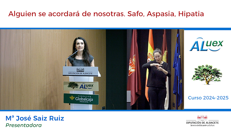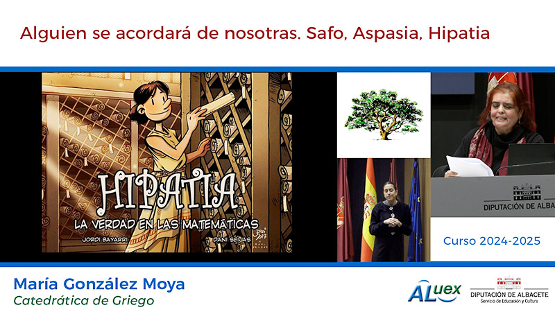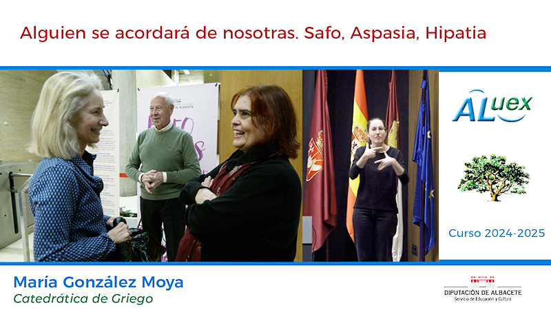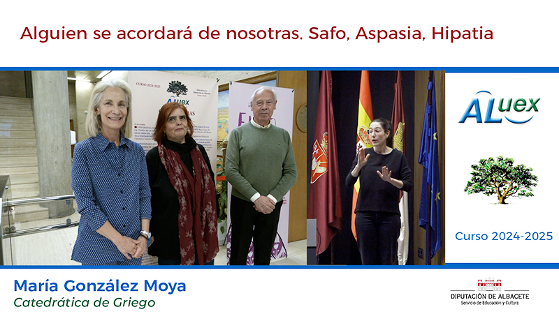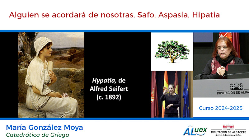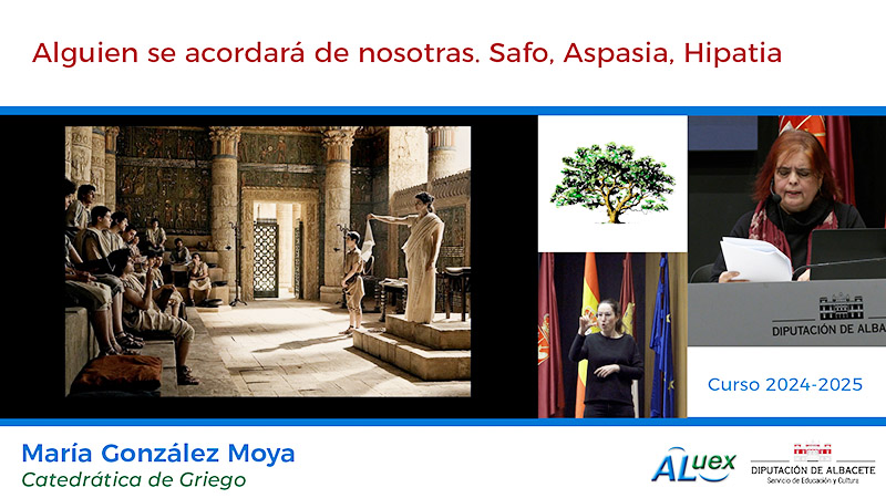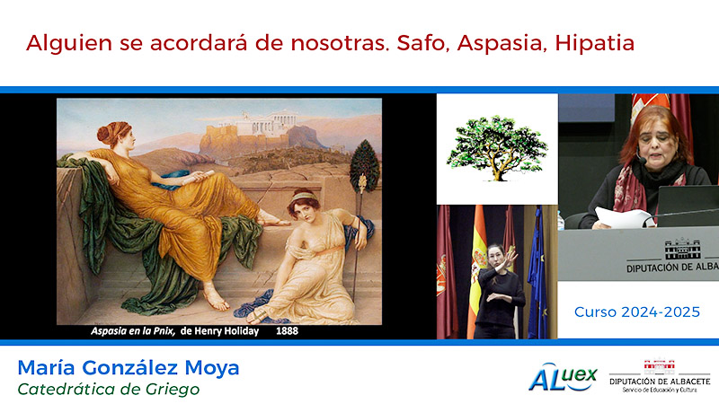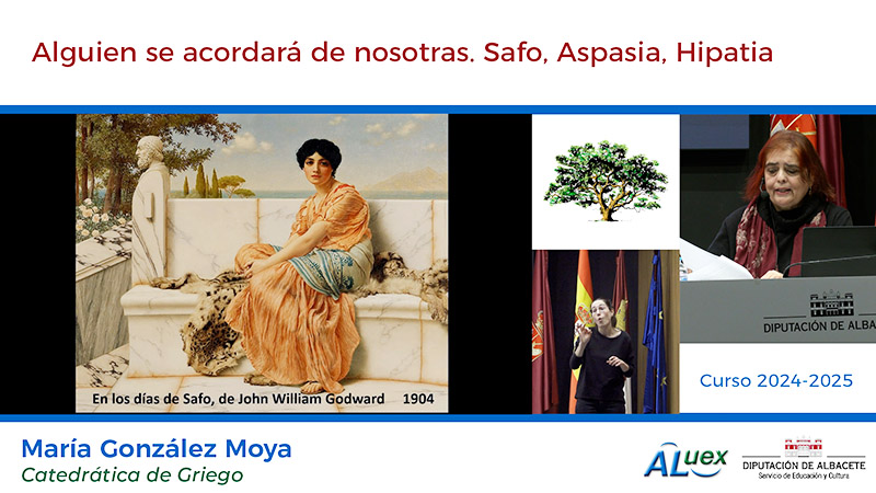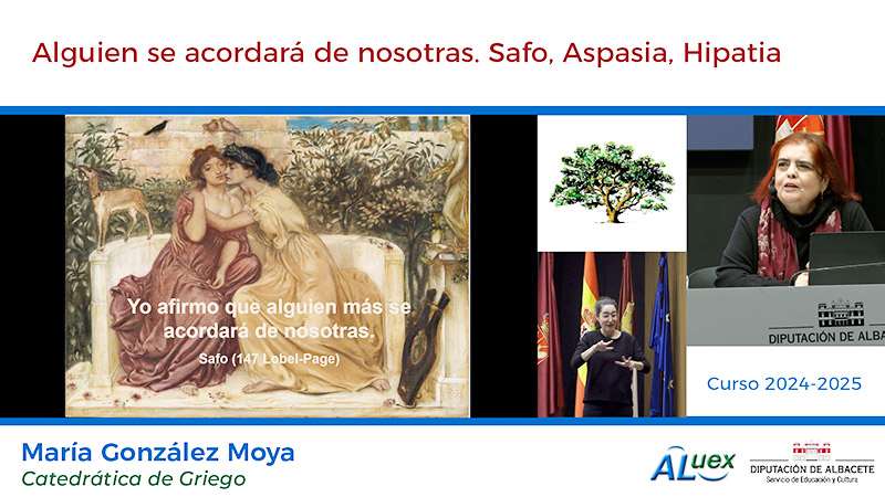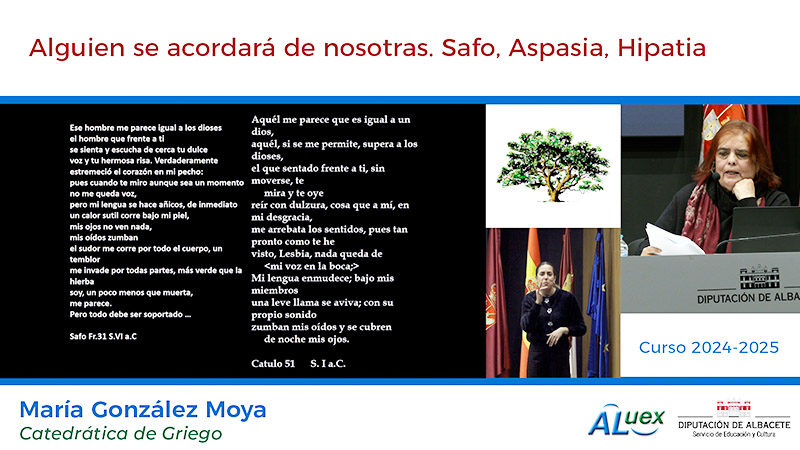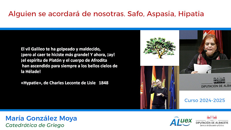 Conferencia número 20. MUJERES DE AYER Y HOY: ALGUIEN SE ACORDARÁ DE NOSOTRAS: SAFO, ASPASIA E HIPATIA. María González Moya. Catedrática de Griego. Fotogramas de la conferencia editados por Carmela Sainz de baranda.
