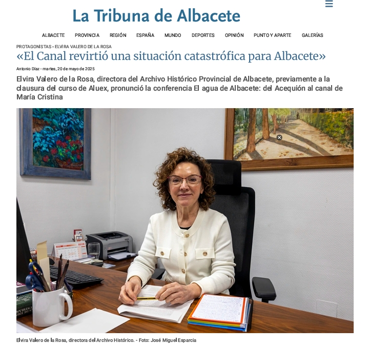 19 de mayo 2025. EL AGUA EN ALBACETE: DEL ACEQUIÓN AL CANAL DE MARÍA CRISTINA. El agua, ¿está ligada al origen de los asentamientos? Claro, el origen de Albacete está muy unido al agua. El termino municipal presenta un poblamiento continuado desde tiempos prehistóricos y esa ocupación viene determinada por las características de Albacete, una zona llana, sin grandes accidentes, que tiene agua en abundancia. ¿Hay peligro de desertificación? Es una amenaza, pero tampoco hay que ser alarmistas. Ha habido fenómenos, como las aguas pantanosas, con aquella enfermedad tan grave que sufrió Albacete, pero a veces hay soluciones. El Canal de María Cristina revirtió una situación catastrófica para Albacete. ¿Esa obra fue fundamental? Sí, el Canal de María Cristina supuso la vida para Albacete. Si no se hubiera hecho, habría desaparecido, porque había años que moría más gente que nacía y la situación era insostenible. Cuando llovía, que era muy a menudo, las inundaciones eran tremendas y lo vemos en las actas. ¿Cuándo comenzaron las obras? Empezaron en 1802, lo que pasa es que tienen unos antecedentes muy interesantes. El primero es de 1774 y es de fray Marcos de Santa Rosa, ingeniero arquitecto hidráulico, y fue el primero que tuvo la idea de hacer un canal para reunir todas las fuentes, todas las aguas en un solo canal y conducirlo hasta la salida del Júcar, ese fue el antecedente, proyecto que se dejó paralizado. Hubo muchos intentos de retomarlos y, aparte de la grave enfermedad de 1802, también influía que, con esas inundaciones, Albacete quedaba incomunicada y los ilustrados a mitad del siglo XVIII, habían apoyado comunicaciones, con seis carreteras radiales, una de ellas, de las más importante, pasaba por Albacete en dirección a Valencia y Alicante y era un tremendo atraso, si había una avenida o inundación, no pudieran seguir. Albacete tenía que renovarse. ¿Entre las obras más importantes? Sí, marca un antes y un después, es un cambio de épocas. En la época anterior, teníamos muy poco control sobre la naturaleza. Es a partir del siglo XVIII, cuando el hombre se ve capaz, por sus medios, de modificar a gran escala la naturaleza, de ahí que venga el canal.