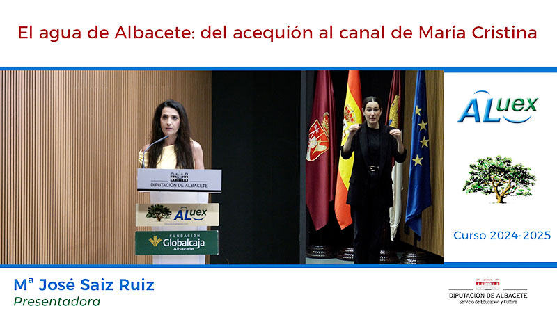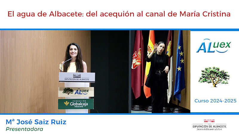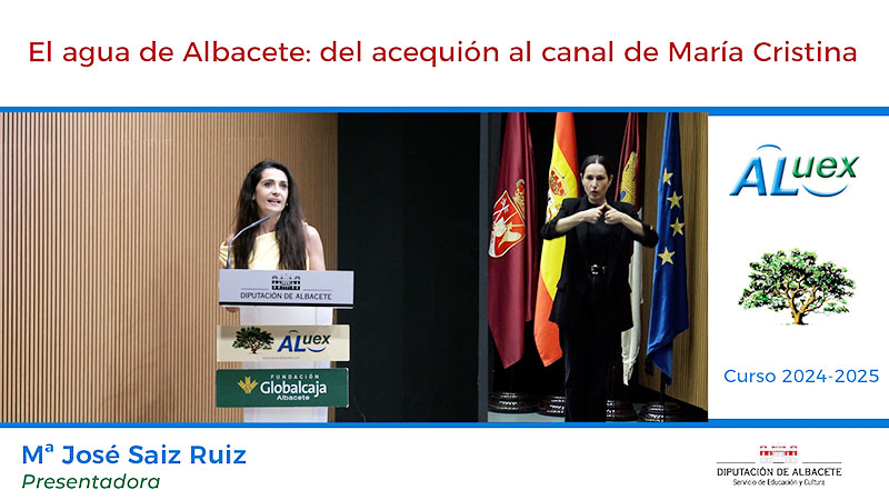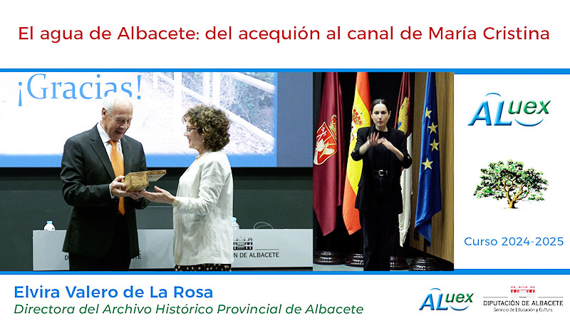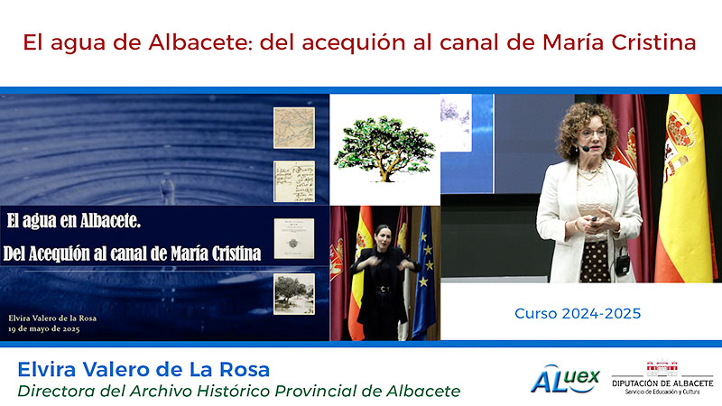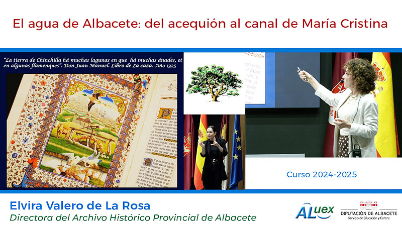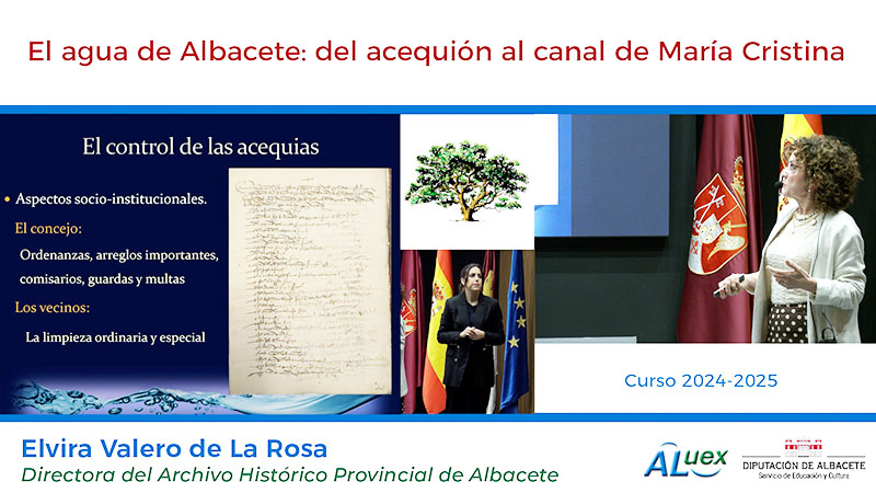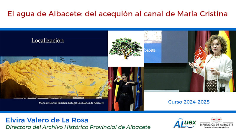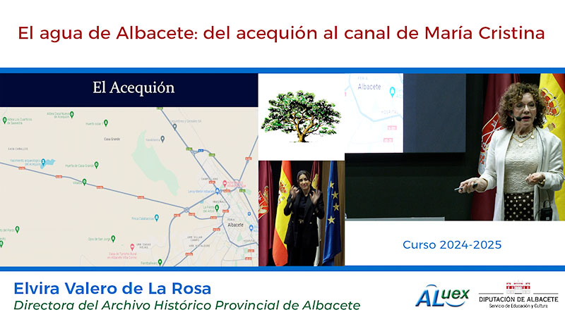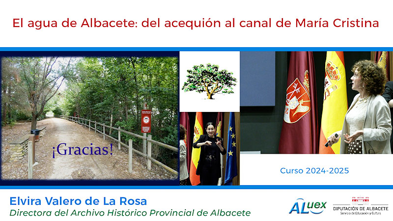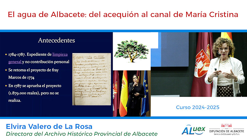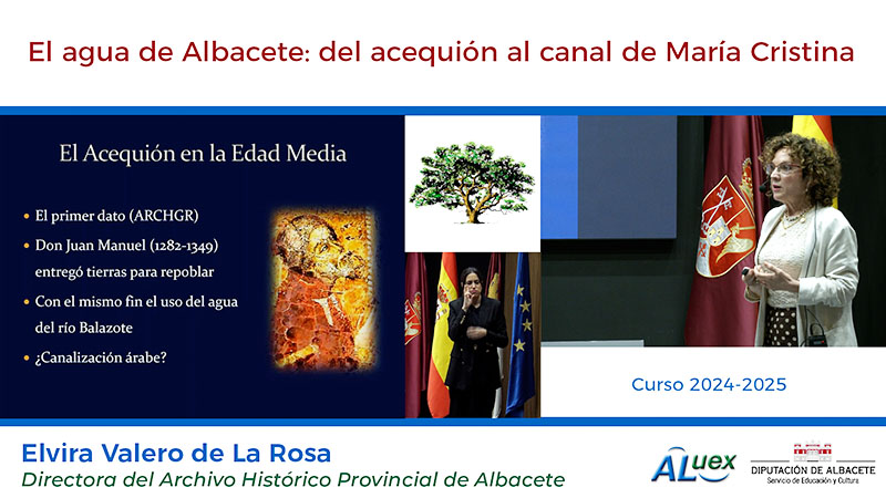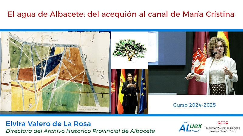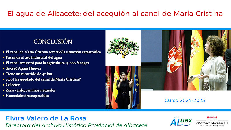 EL AGUA EN ALBACETE: DEL ACEQUIÓN AL CANAL DE MARÍA CRISTINA. Elvira Valero de la Rosa.. Directora del Archivo Histórico Provincial de Albacete. Fotogramas de la conferencia editadas por Carmela Sainz de Baranda: