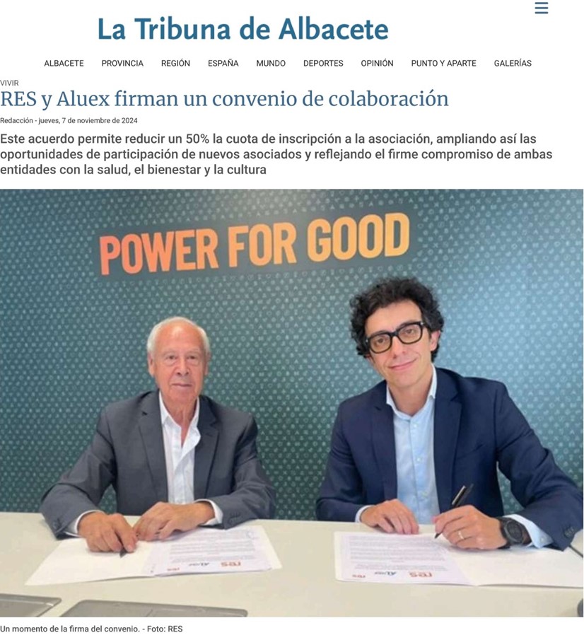 7 de noviembre 2024. CONVENIO DE COLABORACIÓN CON RES. Entrevista en el periódico La Tribuna: El acuerdo fue formalizado en la sede de RES en Albacete por el presidente de la Asociación Aluex, Juan José Caravaca Lario y Adriano García Piquero, Global Head O&M Services de España quien destacó "la importancia de este convenio para seguir impulsando actividades culturales y de bienestar en la ciudad de Albacete, poniendo el foco en un colectivo, a veces olvidado ,como es la etapa de jubilación, a la vez que se fomentan relaciones sociales y un estilo de vida saludable entre nuestros mayores". Juan José Caravaca Lario, presidente de la Asociación Aluex expresó su satisfacción con la colaboración: "Estamos muy ilusionados con la predisposición para ayudar mostrada por RES desde el primer momento. Gracias al apoyo de empresas socialmente comprometidas como RES podemos seguir proponiendo actividades culturales que nos permitan estar activos en la etapa de jubilación, así como aprender, conocer gente, relacionarnos y por supuesto reducir las cuotas de socios". Además de la ayuda directa a la propia Asociación, se puede ver reflejado el enfoque de RES en el cuidado familiar de sus trabajadores, ya que fruto del convenio RES asumirá el coste de las cuotas de inscripción de los familiares de sus empleados para facilitar que padres y madres de los trabajadores de RES puedan disfrutar gratis de todos los talleres y excursiones que realice la asociación a lo largo del año. La Asociación Aluex es una organización sin ánimo de lucro de Albacete, dedicada a mejorar la calidad de vida de sus socios enriqueciendo su nueva etapa tras la jubilación a través de actividades que fomenten su bienestar tanto sanitario como cultural y recreativo, por medio de conferencias, cursos, viajes, o cualquier otra actividad. Así, implementando diversas iniciativas a lo largo de las diferentes etapas de la vida, RES favorece la conciliación familiar de su plantilla con iniciativas como la Escuela de Verano o la Ludoteca gratuita durante el curso escolar para los hijos de los empleados, el fomento de la vida saludable y el deporte entre adolescentes y adultos y el apoyo a los mayores gracias a este acuerdo firmado con Aluex. Con este proyecto y sumado a otras iniciativas sociales desarrolladas en la ciudad como el UmbrellaSky, el apoyo deportivo, cultural y la promoción del uso de la bicicleta como hábito de vida saludable y de cero emisiones, RES contribuye al desarrollo de un futuro mejor para la ciudad de Albacete, fortaleciendo su compromiso social y con el bienestar de los ciudadanos. Acerca de RES RES es la empresa independiente de energía renovable más grande del mundo. Presente en 24 países, desarrolla su actividad en los sectores eólico, solar, almacenamiento de energía, biomasa, energía hidráulica, hidrógeno verde, transmisión y distribución de energía. Como referente en innovación durante más de 40 años, RES cuenta con más de 24 GW en proyectos de energía renovable en todo el mundo y prevé agregar 22 GW de nueva capacidad en los próximos cinco años. Como proveedor de servicios, RES mantiene una cartera de 41 GW de activos renovables distribuidos en 1.300 instalaciones, ofreciendo una alta capacidad y experiencia en gestión de activos, operación y mantenimiento y repuestos. RES ofrece al mercado una gama de productos y soluciones digitales de vanguardia diseñados para maximizar la inversión y el despliegue de energía renovable. RES es el poder detrás de un futuro de energía limpia en el que todas las personas tengan acceso a una energía sin emisiones de carbono, gracias a la experiencia global, la pasión y la innovación de sus 4.500 trabajadores que unen su talento para transformar la forma en que se genera, almacena y suministra la energía. Visita: www.res-group.com
