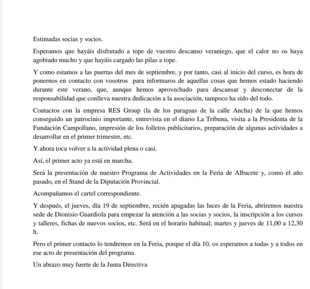 CARTA ENVIADA A LAS SOCIAS Y SOCIOS.