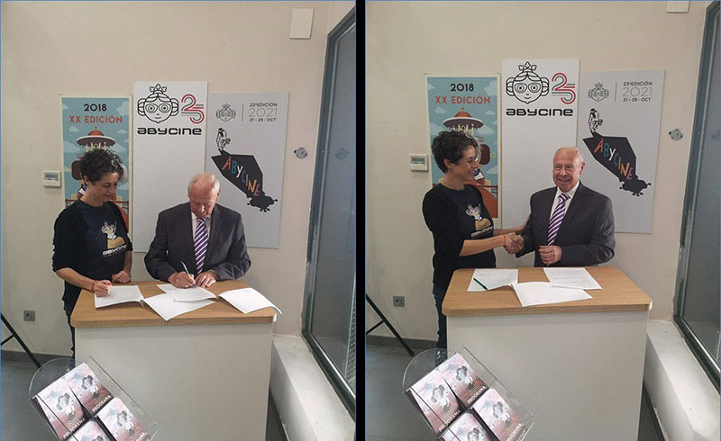 Dos mometos del acto de la firma del convenio de colaboración. En las imágenes, Paula Acebal, Presidenta de la Fundación ABYCINE-Ab Audiovisual y Juan José Caravaca. Presidente de ALUEX