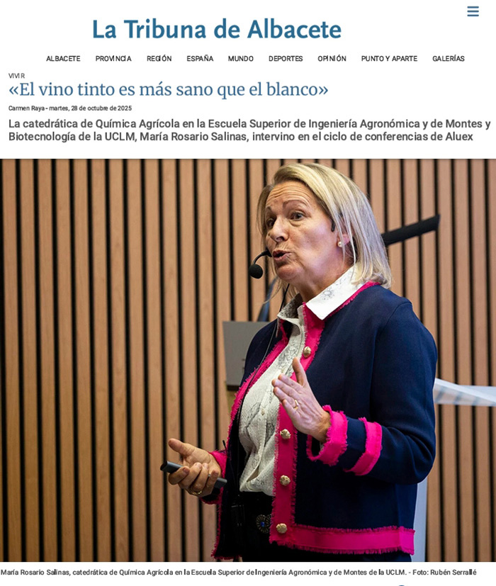 27 de octubre 2025. Conferencia número 3. UNA MIRADA AL INTERIOR DEL VINO. Entrevista a nuestra conferencianta en el periódico La Tribuna: Catedrática de Química Agrícola en la Escuela Superior de Ingeniería Agronómica y de Montes y Biotecnología de la UCLM, Mª Rosario Salinas Fernández impartió ayer una interesante conferencia bajo el título Una mirada al interior del vino, en el marco de las conferencias organizadas por Aluex (Asociación de Amigos y alumnos de la Universidad de la Experiencia de Albacete). Hablamos con Mª Rosario para conocer cómo es el estado actual de la industria vinícola y sobre por qué es importante mirar hacia el interior del vino. Lo que ocurre con el cambio climático es que se acelera la fotosíntesis y se sintetizan más azúcares. Pero también se sintetizan menos ácidos. Entonces, para que una uva se vendimie en el momento óptimo de vendimia, o sea, cuando es mejor para hacer el vino, pues tiene que haber un equilibrio, una relación entre el azúcar y la acidez. ¿Afecta este fenómeno también a los monólogos? Claro, eso tiene unas implicaciones grandísimas en viticultura y en enología. Los enólogos tienen que hacer más correcciones de acidez, porque son menos ácidos, los mostos pues hay que corregirlos también, hay que hacer más maceraciones para sacar más color, etcétera. Siempre hay mucho polémica sobre si el vino es bueno o malo. Sí, lo de siempre, pero lo que no sabe mucha gente es que la legislación española habla de vino como alimento como alimento y como bebida alcohólica. O sea, que tenemos que convivir con las dos cosas. Entonces, ¿son mejores para la salud los vinos tintos que los blancos? El vino tinto es más sano que el blanco porque la uva tinta tiene el color en la piel y no en el interior. Entonces, para hacer el vino tinto, tú tienes que macerar la uva y en ese proceso extraes los compuestos de mayor calidad de la uva. Por lo tanto, en la vinificación en tinto pasan al mosto y luego al vino. Y como en los vinos blancos no se hace maceración, pues se quedan en la piel. Son cosas simples que la gente debería saber, pero al final, cuando se habla de vino, la atención recae en otras cosas. |