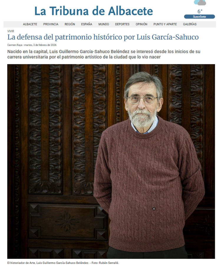 2 de febrero 2026. Conferencia número 13. ALBACETE: NUESTRO PATRIMONIO. Entrevista a nuestro conferenciante en el periódico La Tribuna de Albacete. Licenciado en Filosofía y Letras y Catedrático de Historia del Arte, García-Sahuco es también miembro fundador del Instituto de Estudios Albacetenses. Ayer, ofreció una interesante ponencia en el salón de actos de la Diputación en el marco de la programación del 2026 de la Asociación de Antiguos Alumnos de la Universidad de la Experiencia (Aluex) y bajo el título Albacete: nuestro patrimonio. Hablamos con él sobre Albacete y sus 'joyas'. ¿Cuál es la idea o el mensaje principal que quiere dejar en el público? Mi objetivo es hablar de algunas cosas significativas del patrimonio histórico-artístico actual de Albacete. Justo lo contrario que hice hace unos meses cuando en el centro Ágora hablé de ciertos elementos del patrimonio de Albacete que habían desaparecido. Me centro en la arquitectura, la escultura, la artesanía, la pintura y, cómo no, en la cuchillería. De todas las obras que se encuentran dentro de esas disciplinas, ¿cuáles son las más conocidas y las más desconocidas? En arquitectura, por ejemplo, todo el mundo conoce el Pasaje de Lodares, pero en realidad, el patrimonio arquitectónico más importante que tiene Albacete son las columnas de la Catedral San Juan Bautista. Son una obra excepcional y de lo más importante del renacimiento español. En cuanto a la escultura es algo más escasa, pero hay unos relieves que existen en una entidad privada, que es el Colegio Notarial, que son de un escultor llamado Ignacio Pinazo, que vivió en Albacete en los años 20. Existen y están muy bien conservados. ¿Y en cuanto al resto de disciplinas? En pintura, contamos con el conjunto de grisallas que recientemente se han restaurado en la sacristía de la catedral. Una obra del Renacimiento tardío, de 1580, que merecen ser conocidas. Luego están las artes que son menos conocidas, como las artes del metal, la platería. Y aquí es donde muy poca gente sabe que en Albacete, desde nuestra humildad, tenemos la custodia del Corpus, que es del año 1580, aproximadamente. También es importante, cómo no, la cuchillería, pero eso es algo de sobra conocido por todos. ¿Cómo se puede evitar que estos elementos se deterioren o destruyan con el paso del tiempo? De los que acabo de hablar, todos están a salvo porque están siendo cuidados y restaurados. Para los que son más desconocidos dentro del patrimonio de Albacete, hay que divulgar para conocer y para poder respetar. Porque del conocimiento sale el respeto hacia todo lo que existe. Porque en nuestra ciudad, lamentablemente, ha habido momentos en que se han destruido muchas obras de arte por vandalismo, por incultura y por barbaridades. Entonces se ha destruido, sobre todo, el patrimonio arquitectónico. Hay que pensar cómo era la que llamamos la calle Ancha, la calle Tesifonte Gallego, hace 50 años, que nada tiene que ver con lo que es actualmente. Si se valora, se quieren las cosas y se defienden. El objetivo ha de ser la difusión del conocimiento de los valores artísticos para evitar su destrucción.
