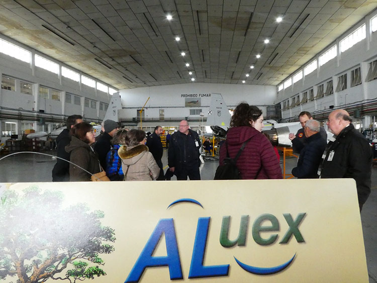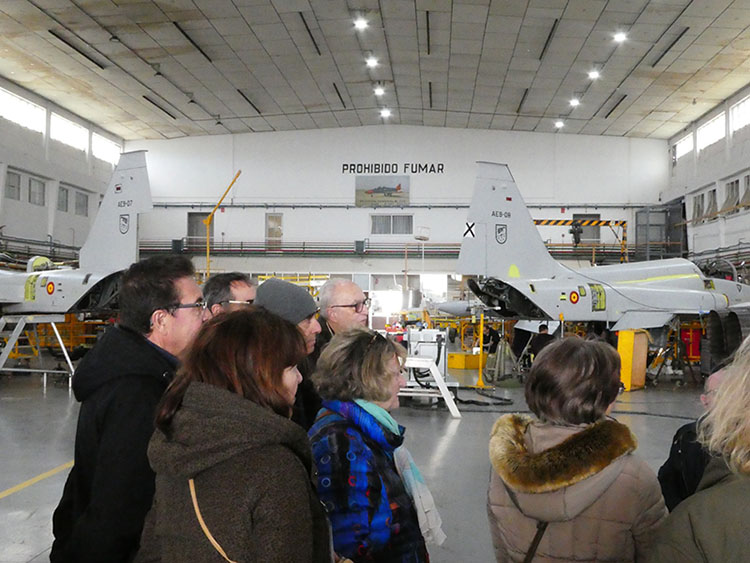 Por el número de asistentes de ALUEX, el personal de la Maestranza nos dividió en dos grupos, dirigidos por la Cabo Dña. María Jesús Soria Valenciano y el cabo Primero D. Agustín Rodríguez ballesteros, incrementando así, la eficacia y eficiencia de nuestra visita. Fuimos visitando los distintos talleres que configuran el complejo de la Maestranza. Cada uno dedicado a una finalidad distinta, bien sea por reparación y construcción de piezas, bien sea por tipos de aeronaves a tratar. Vimos la precisión con la que se trabaja, en algunos casos llegando hasta la milésima de milímetro, la alta profesionalidad y tecnología sumamente diversa que debe asistir a los objetivos que se deben alcanzar. Aprendimos sobre la complejidad de los motores y otros componentes de los aviones, sobre la importancia de sus materiales con sus aleaciones. Y, al final a todos nos llamaron la atención las aeronaves para combatir los incendios, por sus grandes dimensiones, por su capacidad para la recogida, transporte y vertido de agua (dulce o salada) para su extinción o por su forma que le permite aterrizar o amerizar.